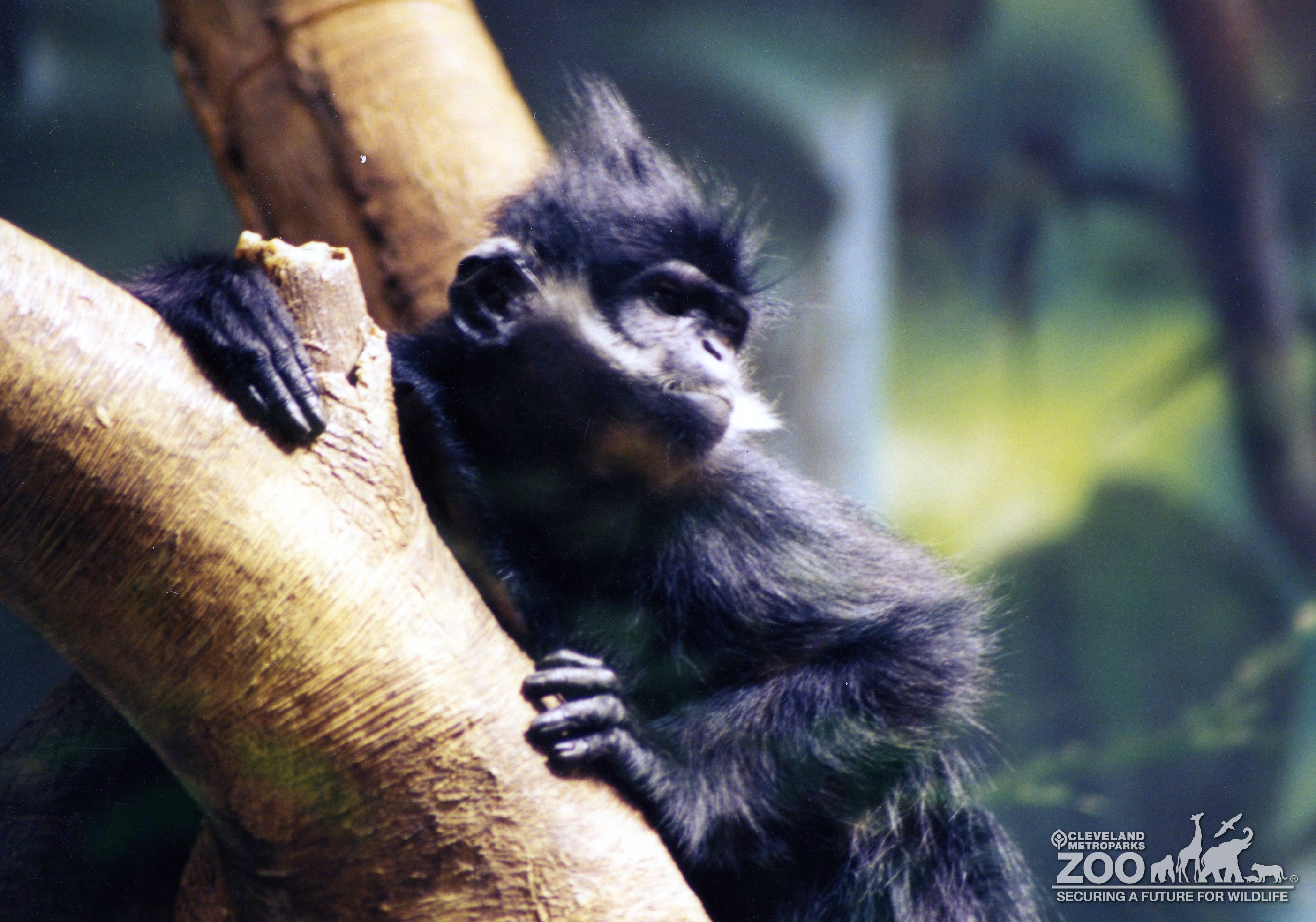 Francois langur up in a tree in The RainForest exhibit. Animal is climbing and looking to your right. Long fingers and shiny black fur a visible.