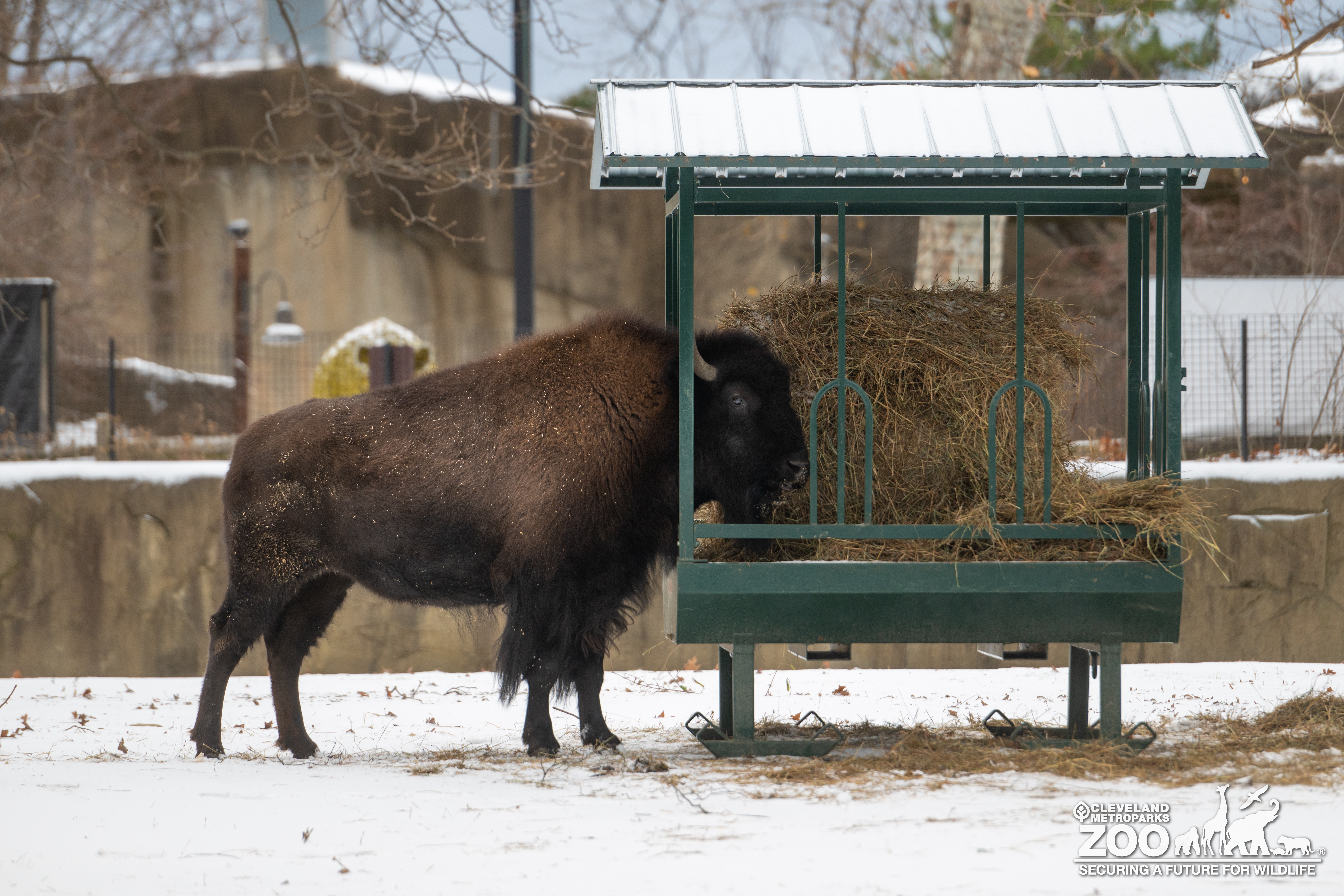 bison eating hay from trough in snow