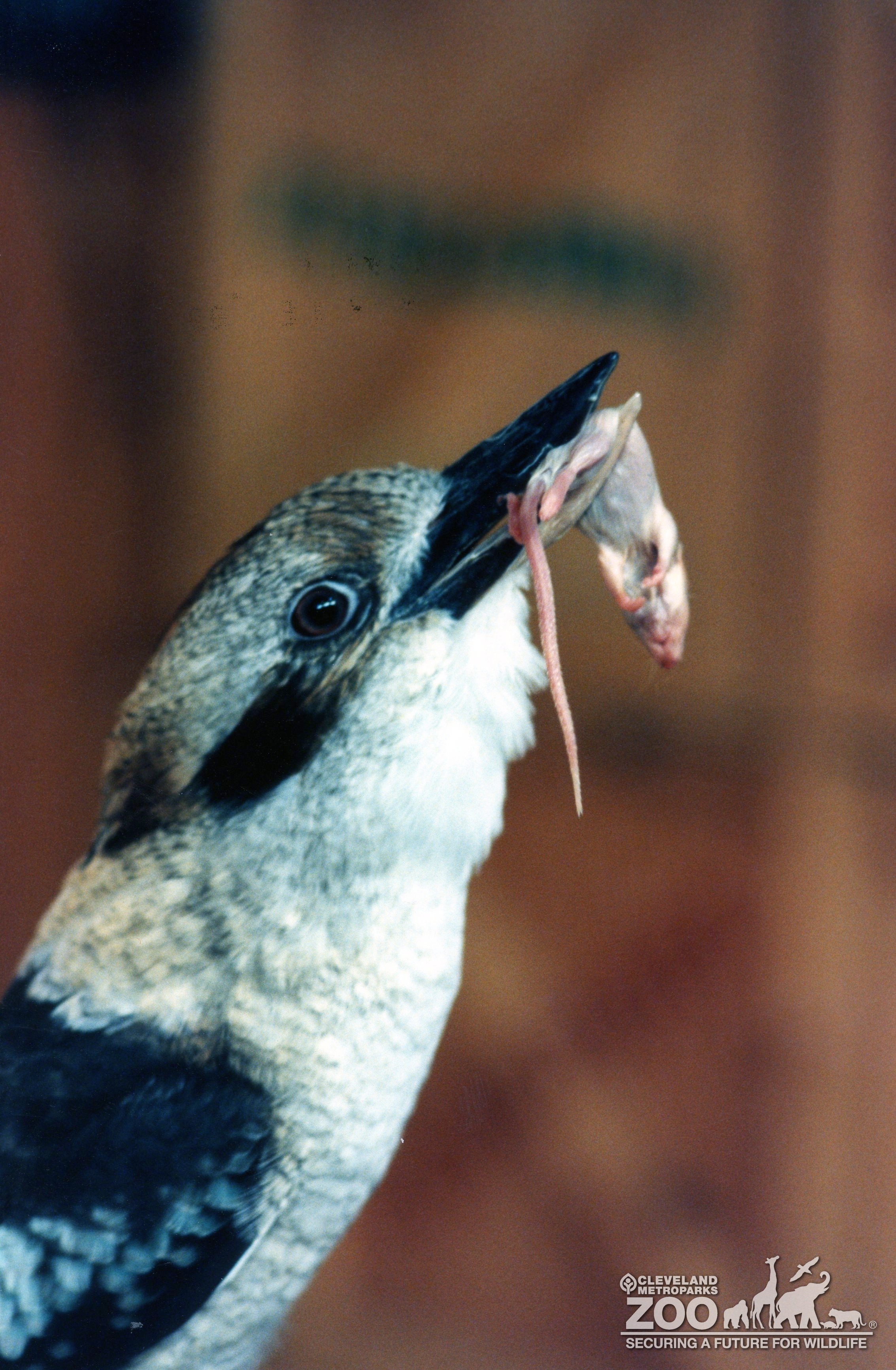 Kookaburra with head tilted up with mouse in its beak. View is of the bird's profile.