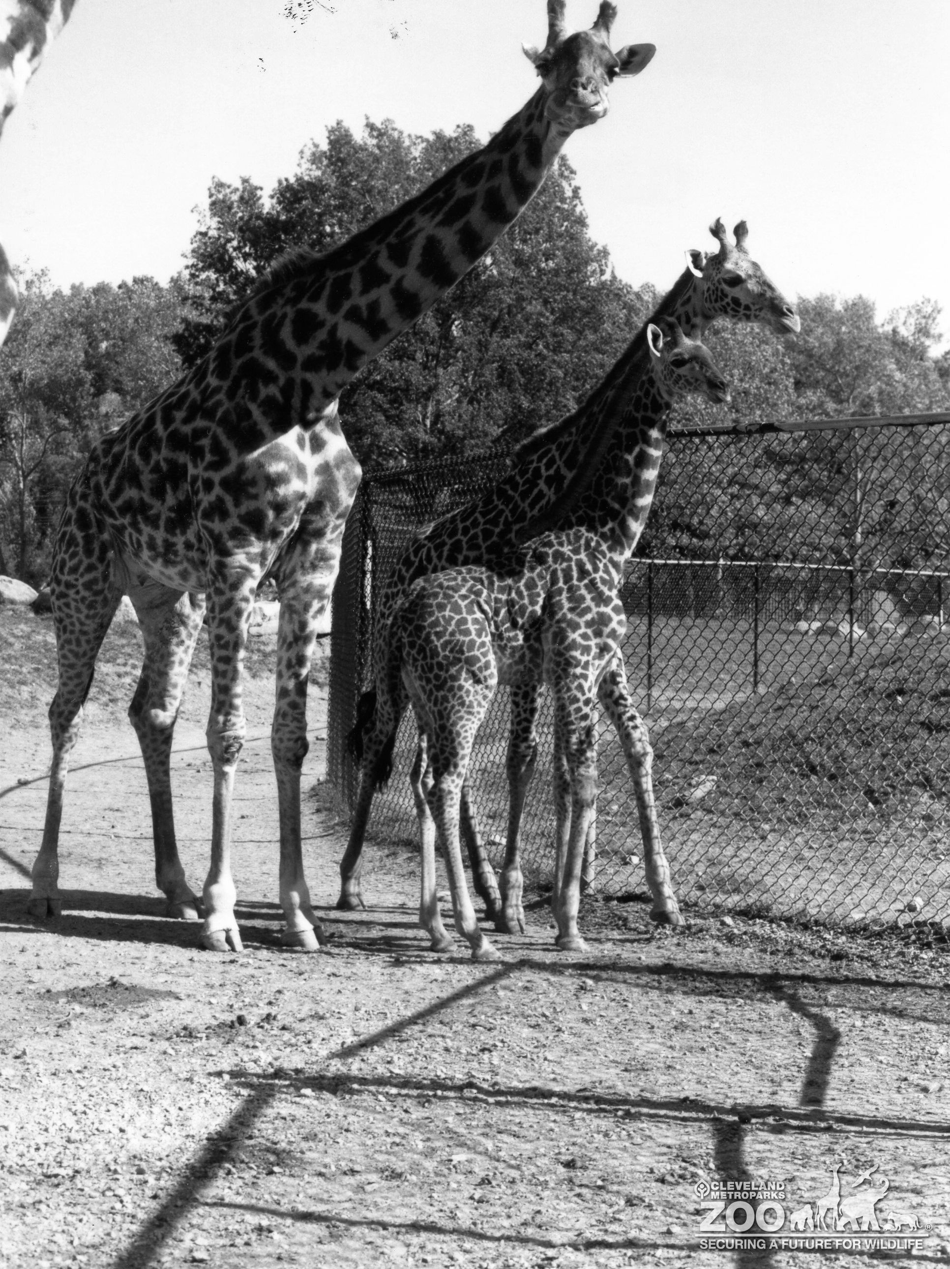 Black & white image of two adults & one young Masai giraffe outside. One of the adults is looking directly at you. Tall chain link fence is in the background.