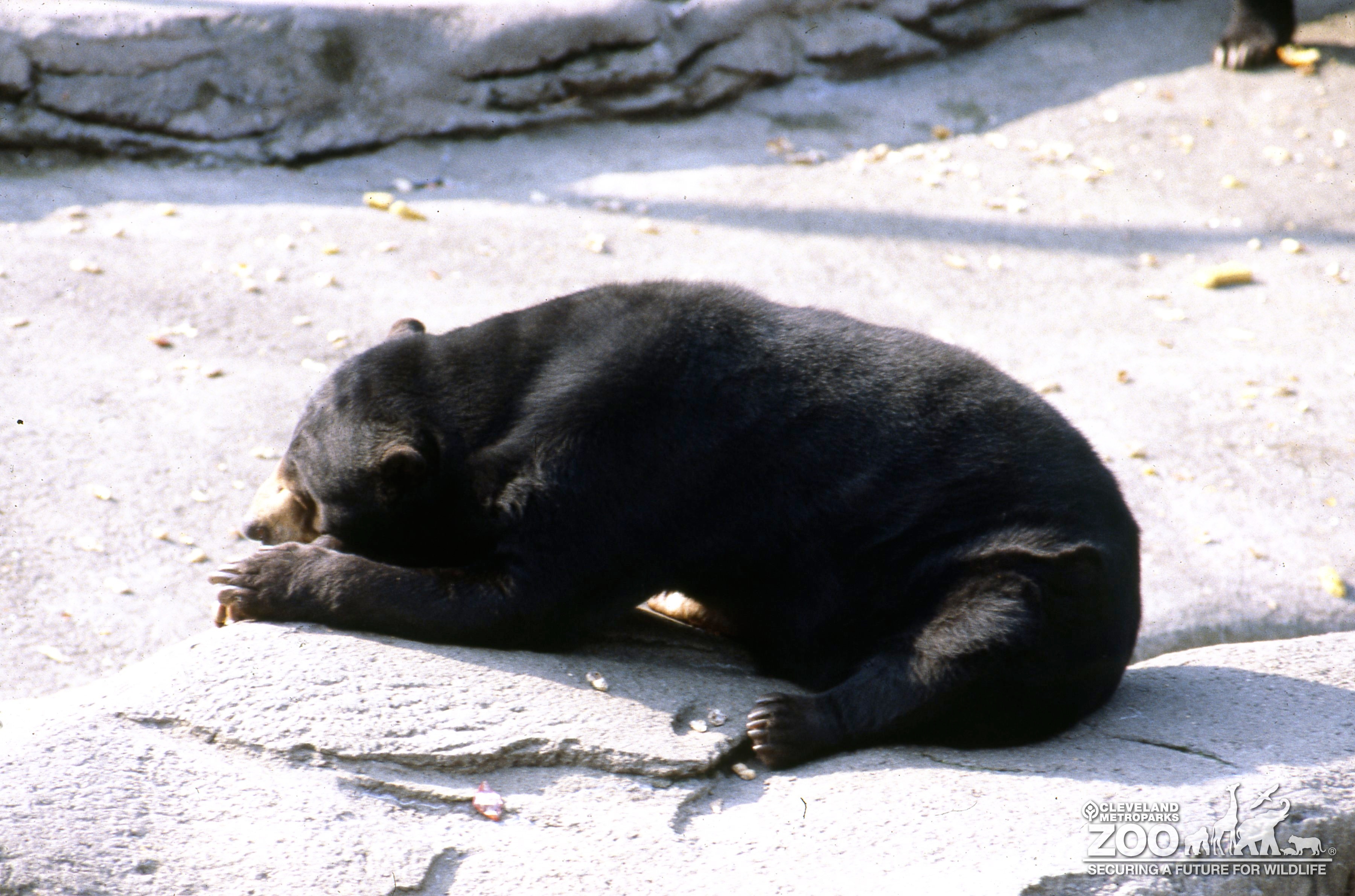 This Malayan Sun Bear is laying in the sun in it's outdoor enclosure. The bear is facing the right with it's head between paws as if it is chewing on something. The bear is covered in short black fur with light brown fur around it's muzzle.