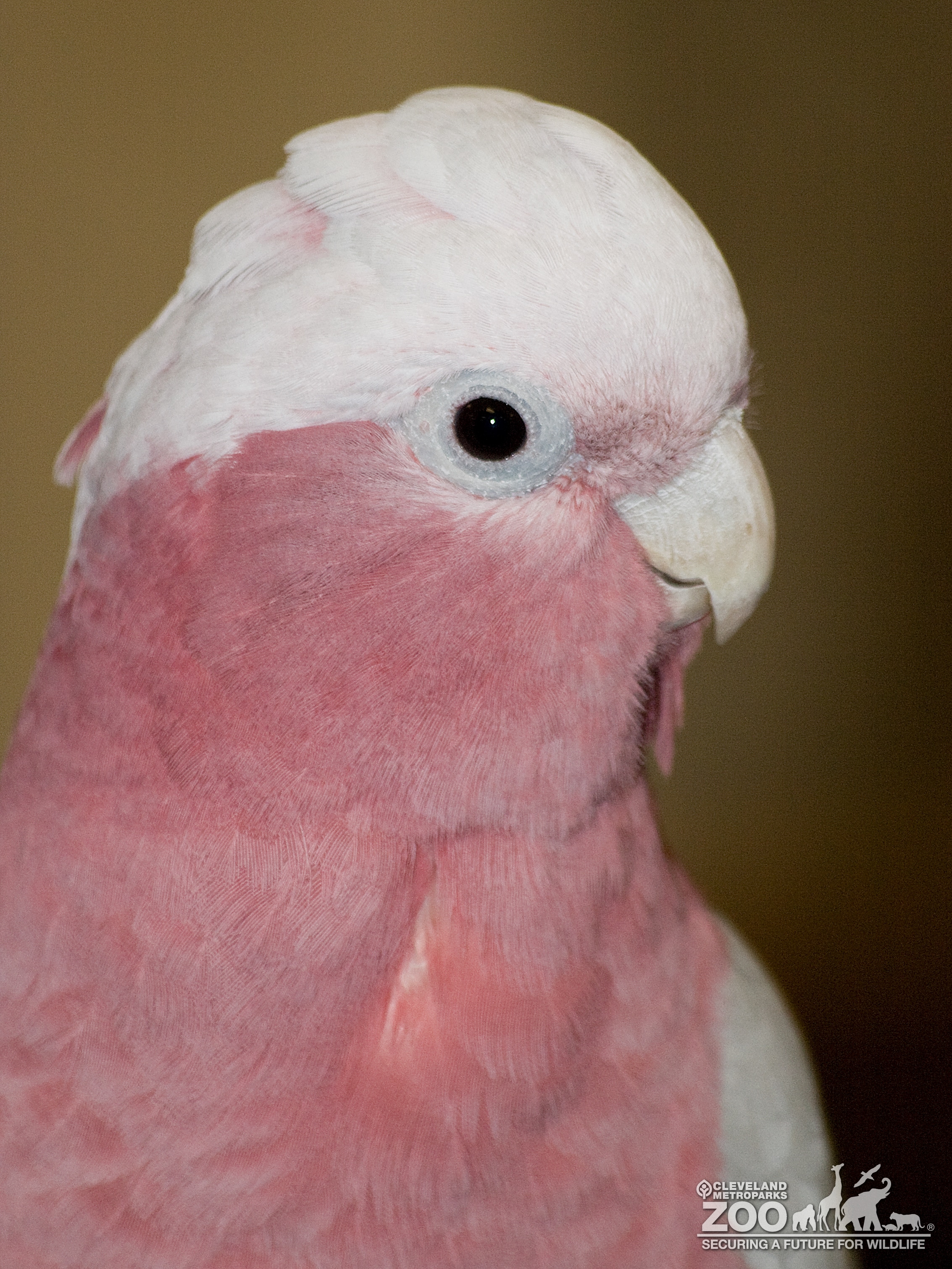 The parrot is white with a pink breast. The parrot is close to the camera and you can see it dark beady eye and white beak.
