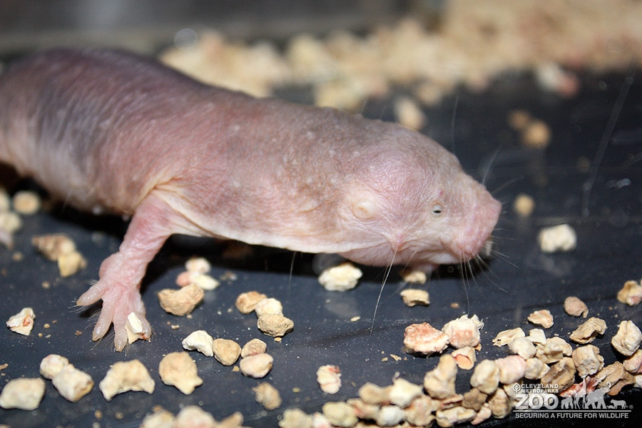 Naked mole-rat close-up. Mole-rat is pink and hairless. It is on a dark surface with pebbles or cat litter scattered around. It has very tiny eyes and ears.