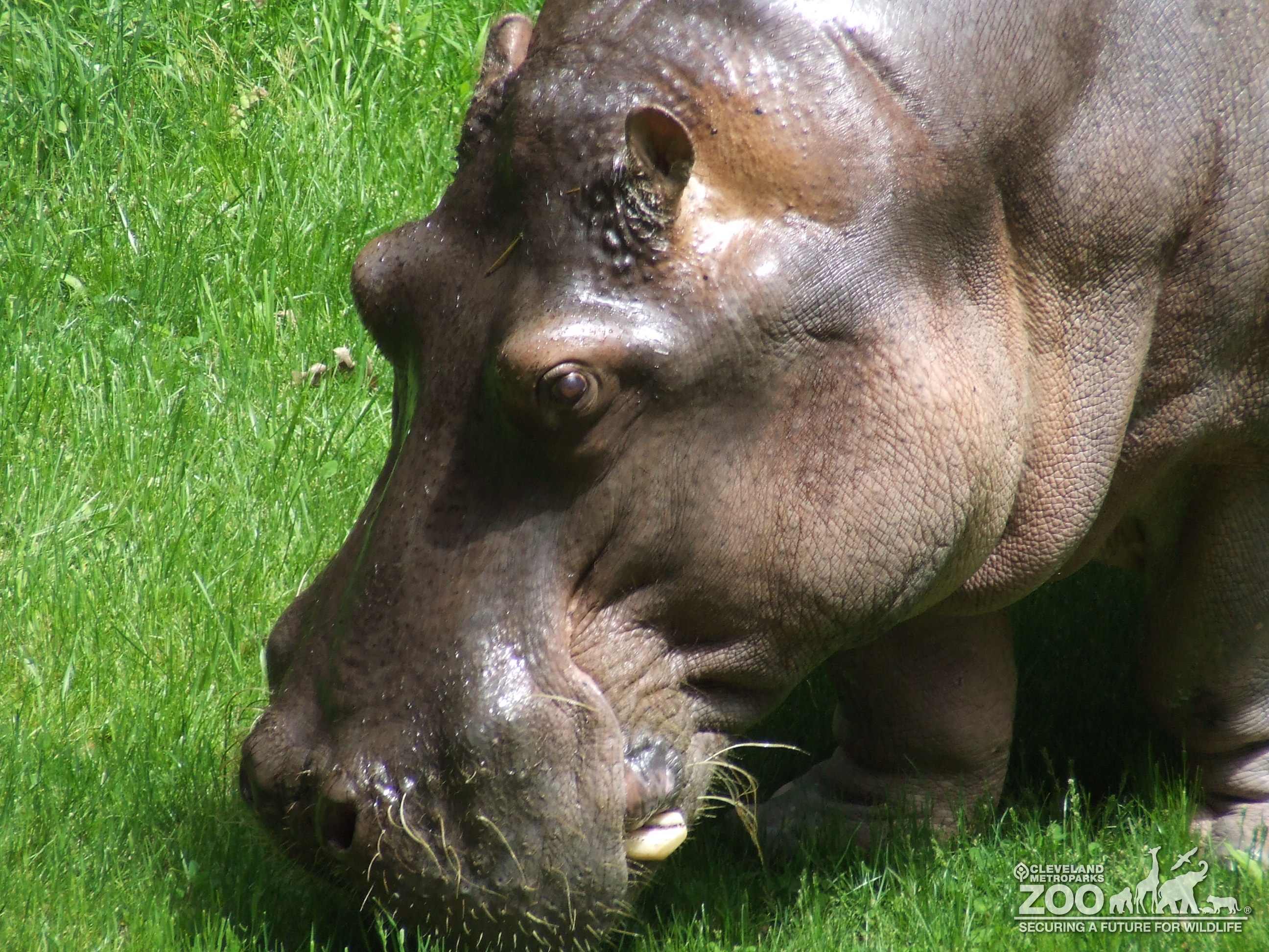 Nile hippo, Blackie, grazing on grass in his habitat behind the old Pachyderm building. Sun shines off his thick skin.