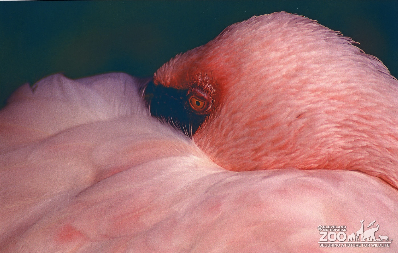 Close up view of flamingo head in shades of pink. Focus on eye in center of photo looking toward left and down above partially obscured black beak.