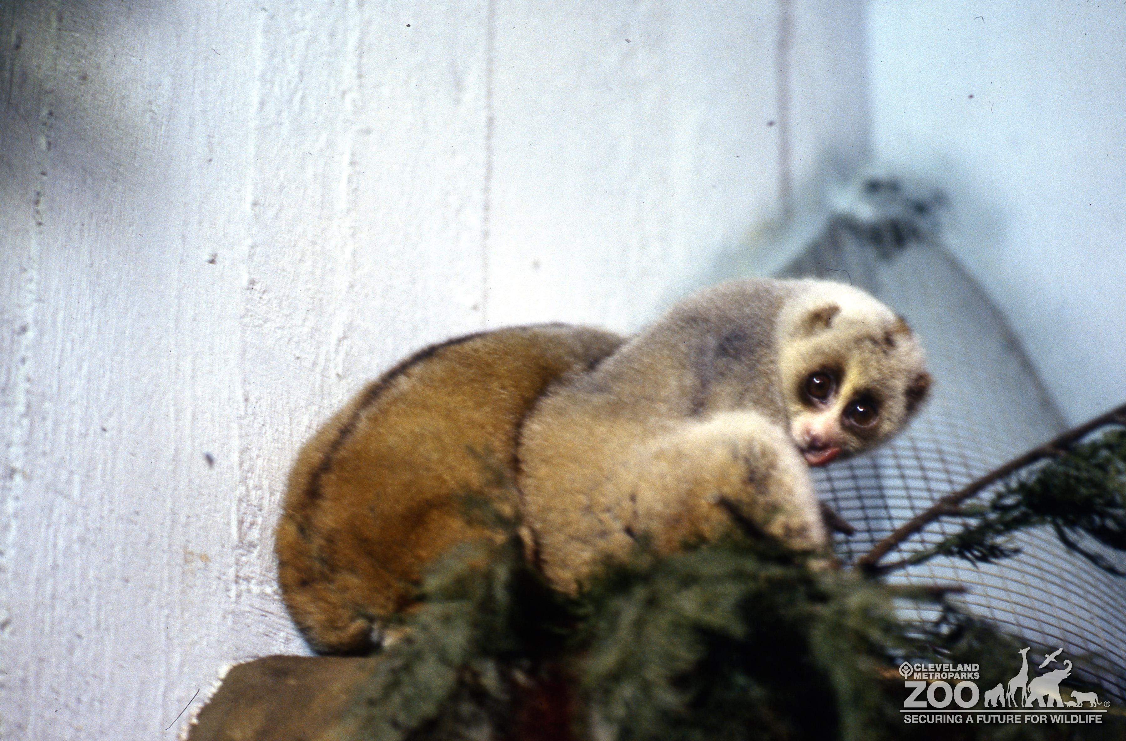 Pair of lesser (pygmy) slow loris climb in their indoor exhibit space. One is looking back over it shoulder. Animals have golden brown fur and large round dark eyes.