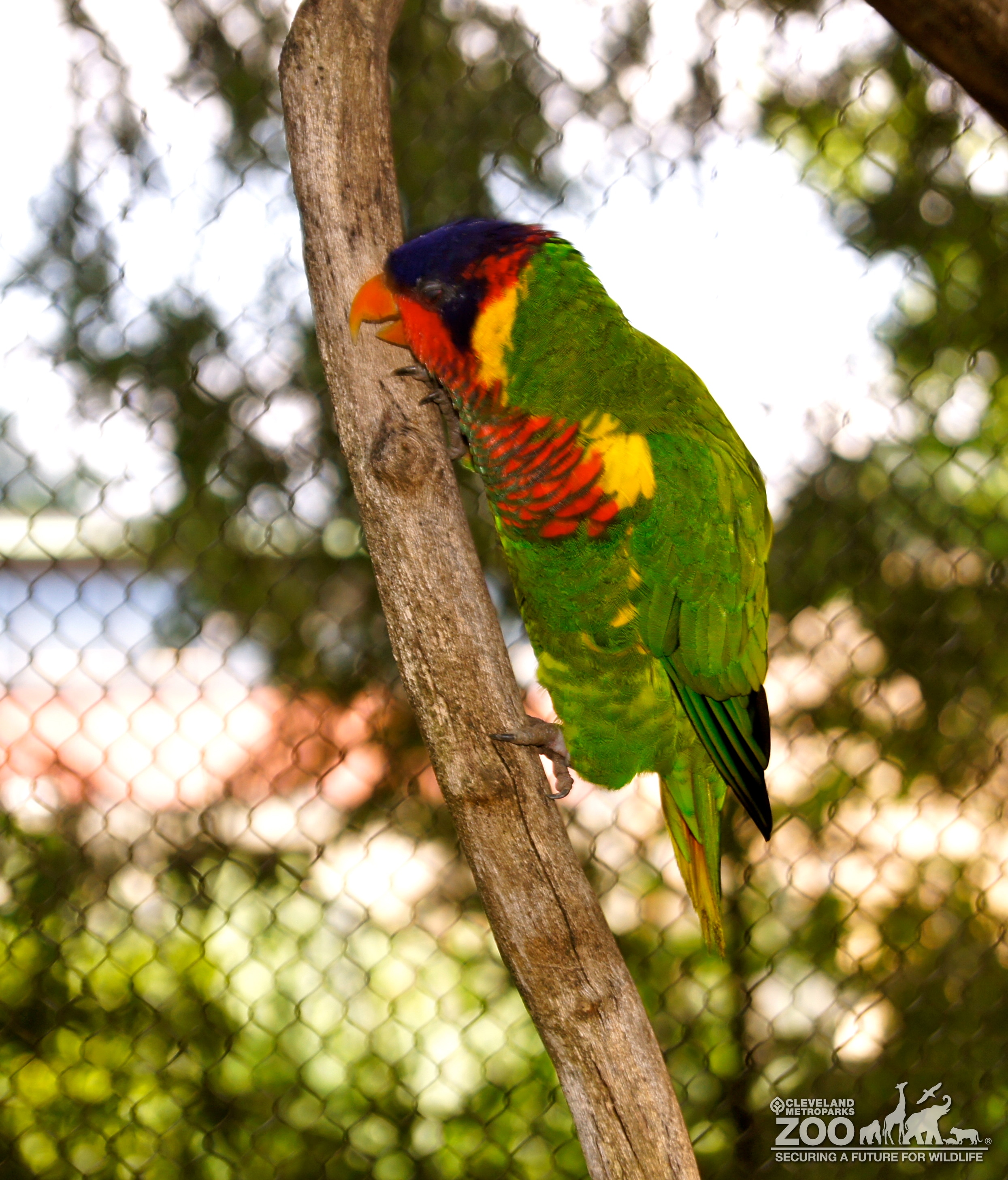 Ornate lorikeet viewed from the side. It is perched on a branch in the outdoor aviary at Lorikeet landing. Feathers are bright primary colors.