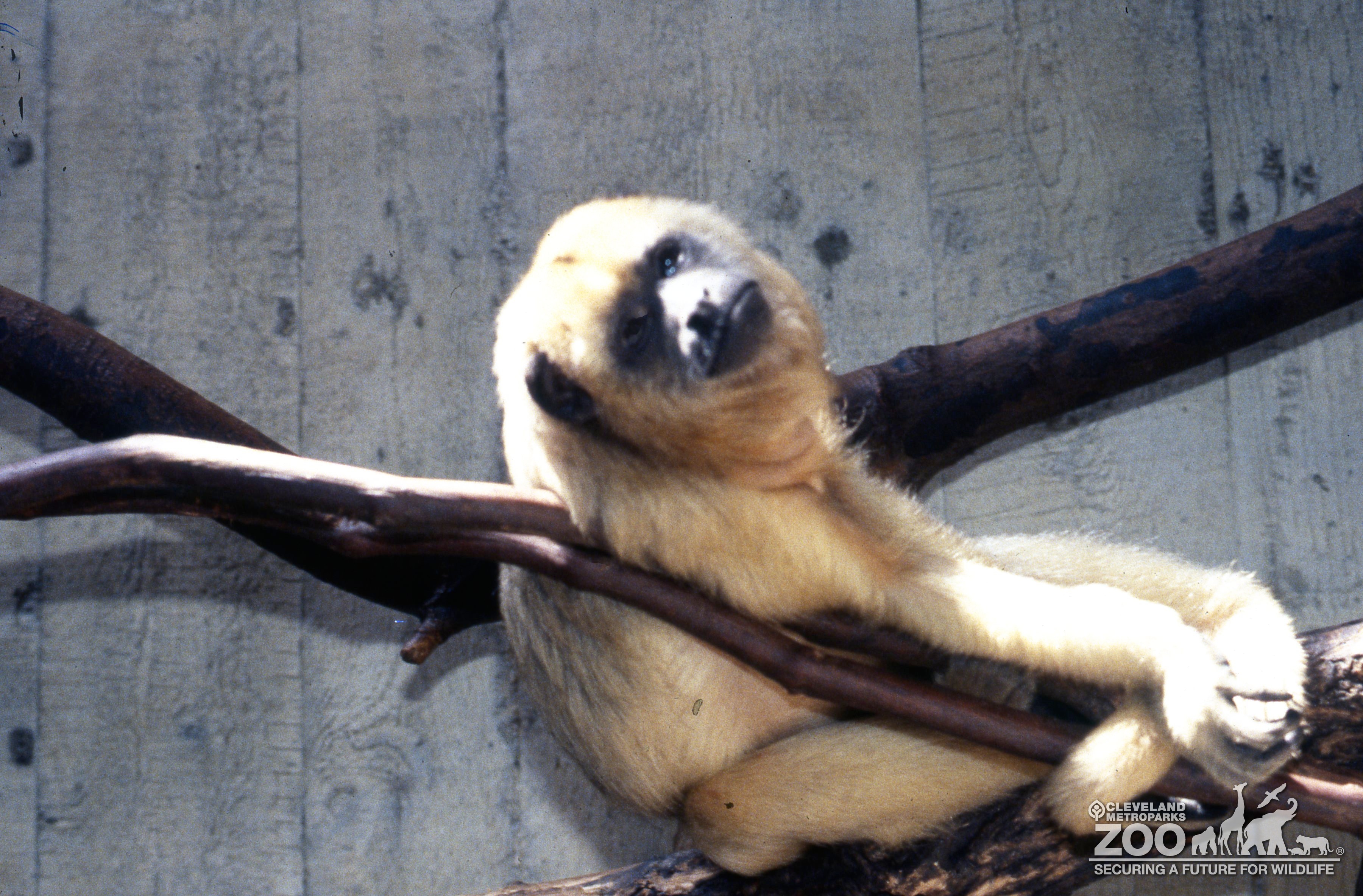 Black howler monkey laying back in the crook of branches. Primate has golden tan fur and black face and hands. Taken in Primate, Cat & Aquatics building.
