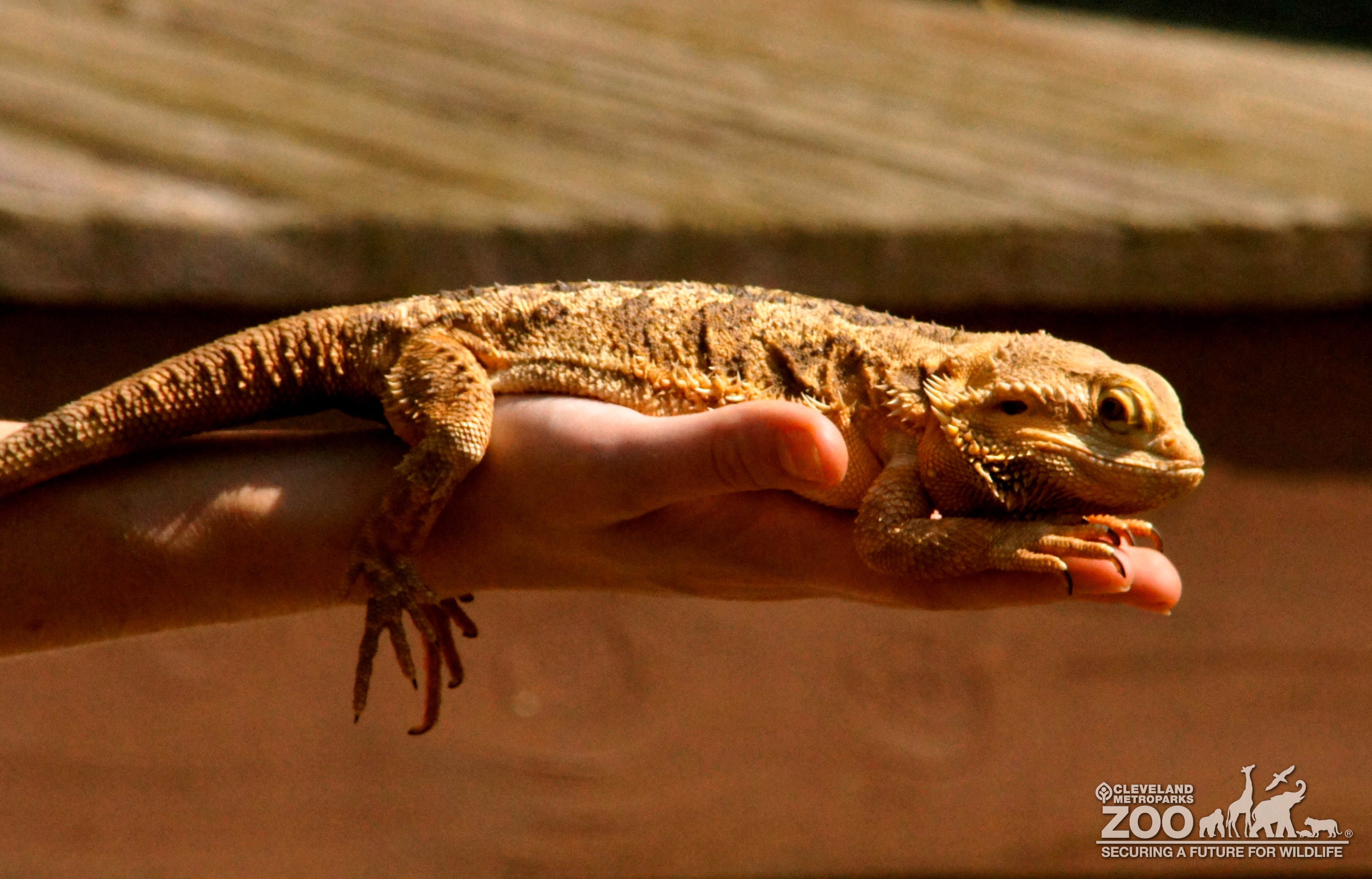 Profile view of bearded dragon facing right and laying on a person's open hand. Back legs with long toes hanging over the person's wrist while front legs are bent forward under the bearded dragon's head.