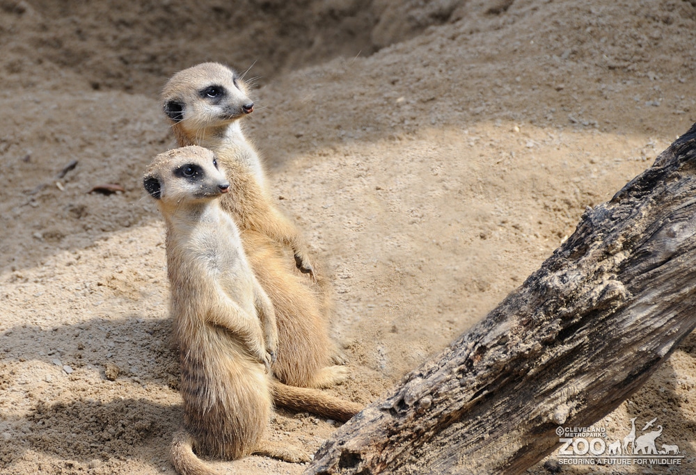 Pair of meerkats looking to your left. They are in their outside habitat. They are sitting up but slightly leaning back.