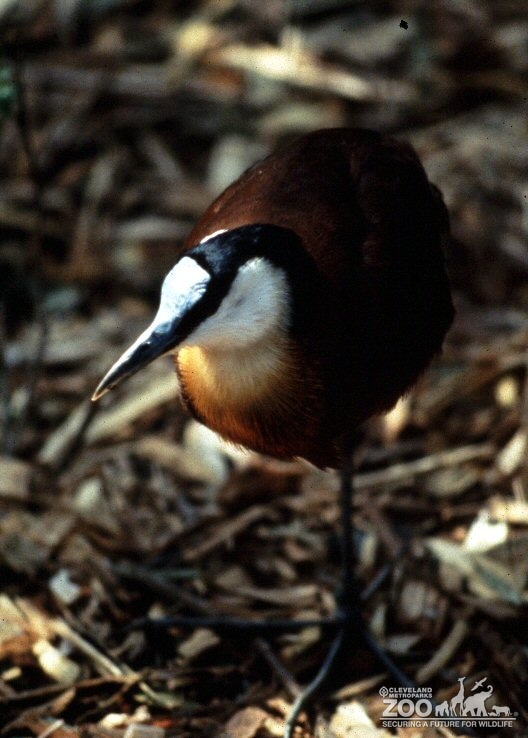 Wattled jacana is walking toward you. Bird is walking on leaf litter. Its beak is narrow and pointed.