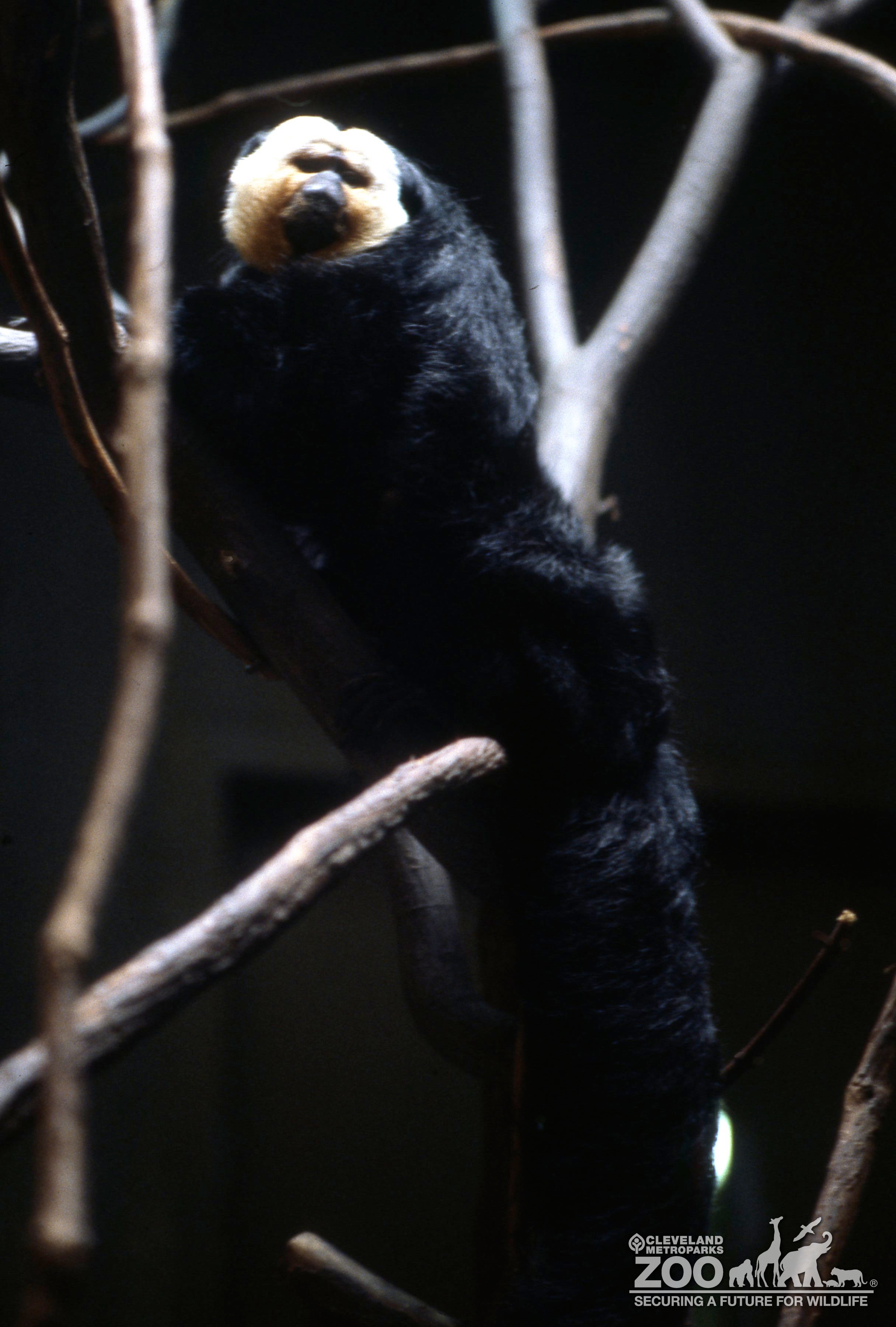 Also known as white-faced saki monkey, the male primate is sitting in a tree. Its unique white face is highlight by the sun shining above it.