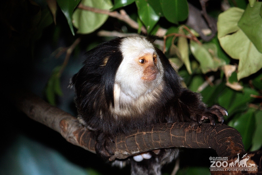 White-fronted marmoset climbing a branch and looking to your right. Shiny jungle leaves surround it.