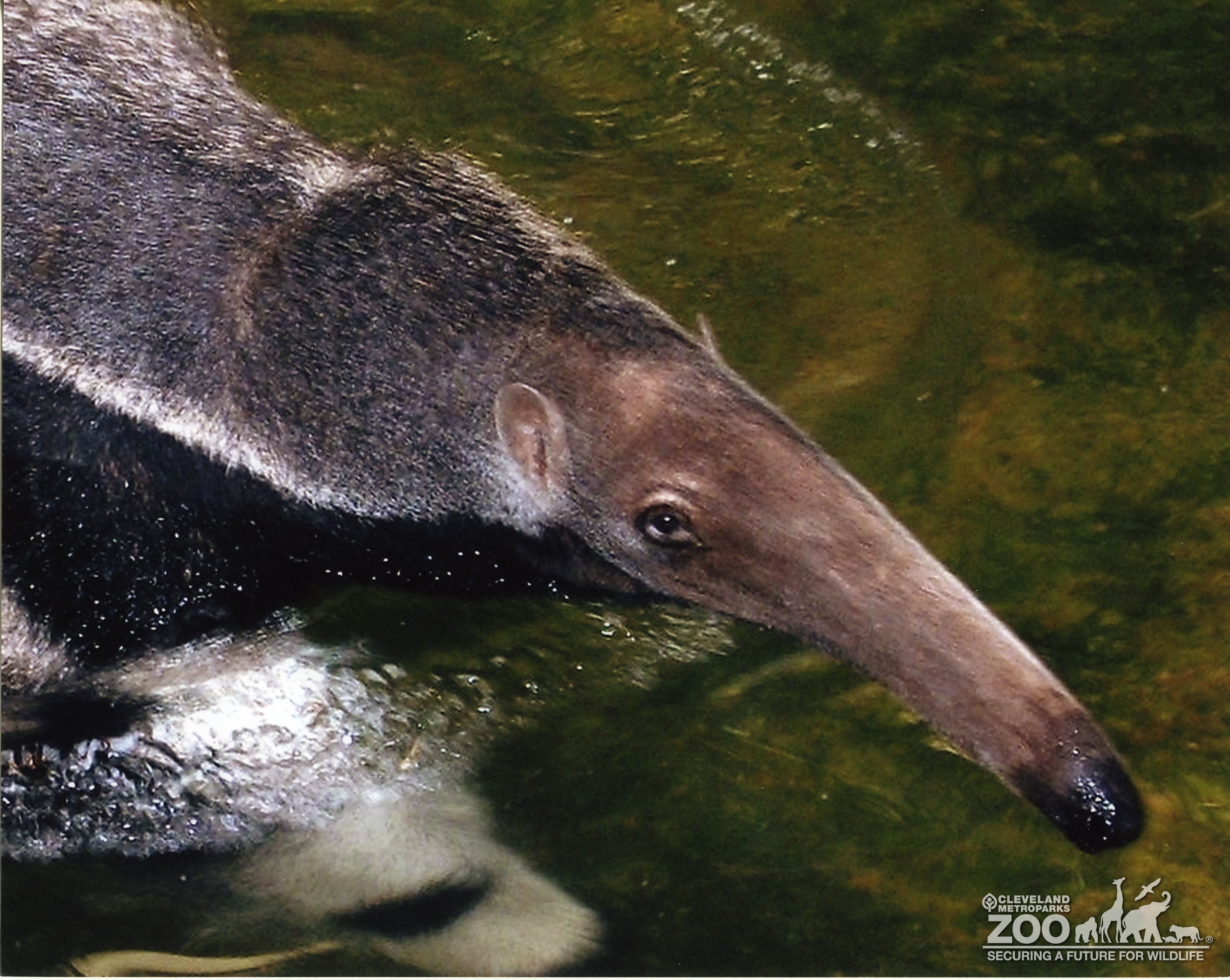 This Giant Anteater is swimming in a pond of light green water looking up at the camera. This photo is take very close to the Anteater's face giving a clear view of it's brown eyes, black nose and brown ears. It looks similar to a bear with gray fur, but it's face narrows into long tubular snout.
