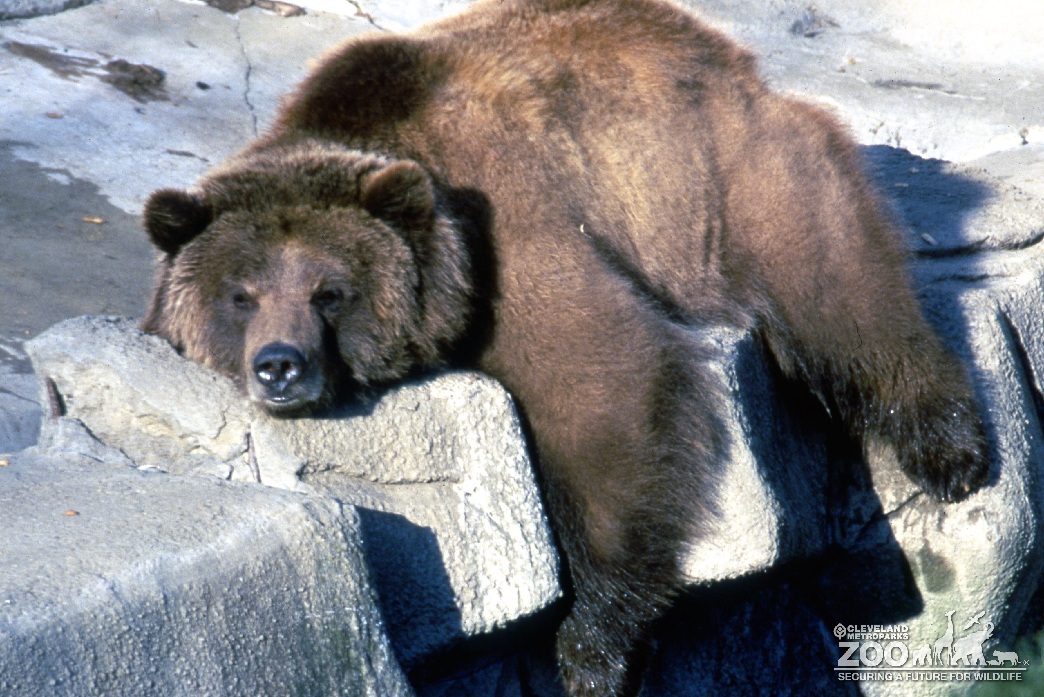 This Grizzly Bear is laying on it's belly on the edge of a grey rock cliff in it's outdoor enclosure. The bear's left front and left rear leg are dangling off the side of the cliff while the rest of Grizzly is comfortably stretched out on the cliff edge. The bear is covered in reddish brown fur that gets darker as it reaches it's paws, the bear also has a big black nose.