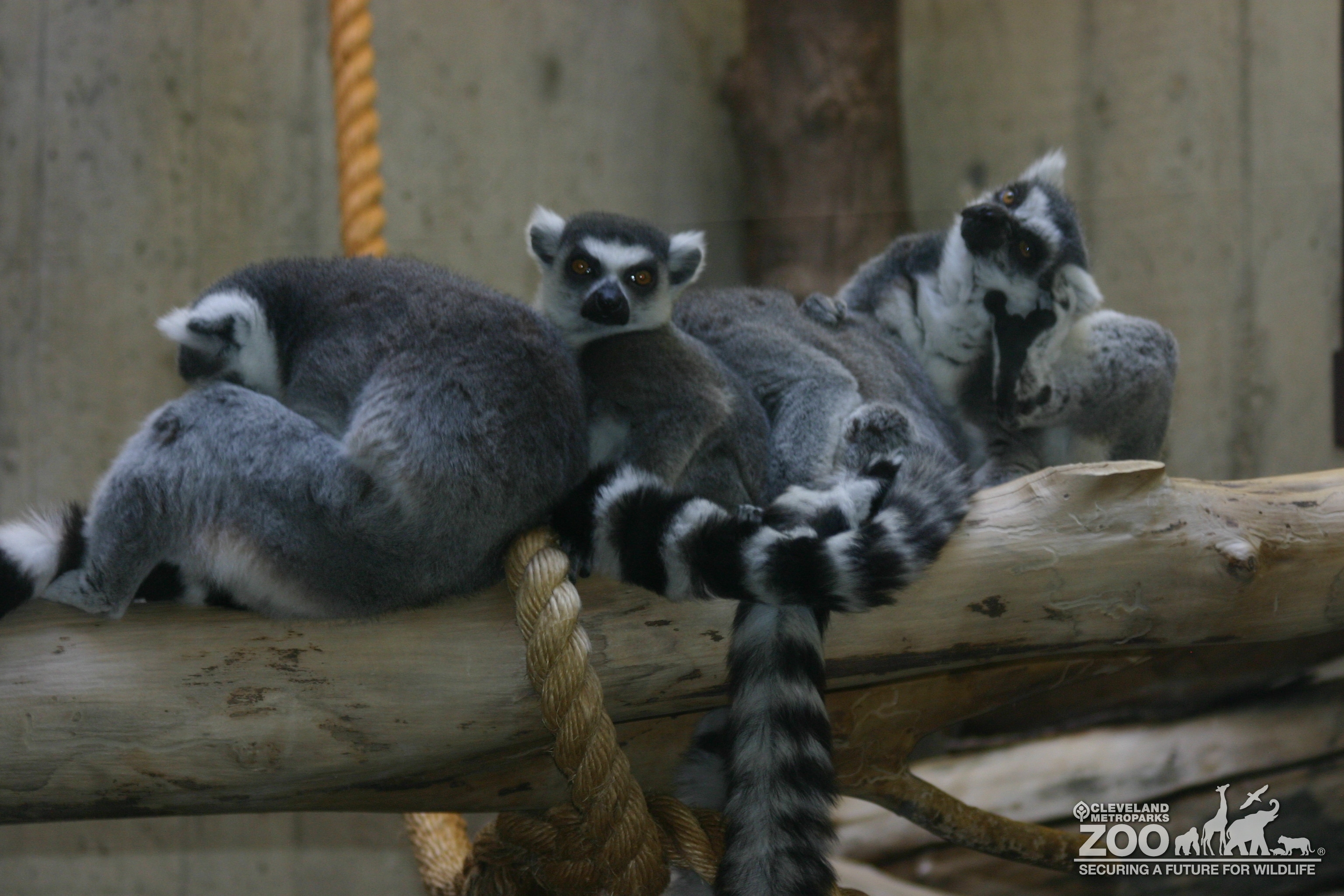 A group of ring tailed lemurs sitting very close on a log. They are grooming each other. Taken in the Primate, Cat & Aquatics building.
