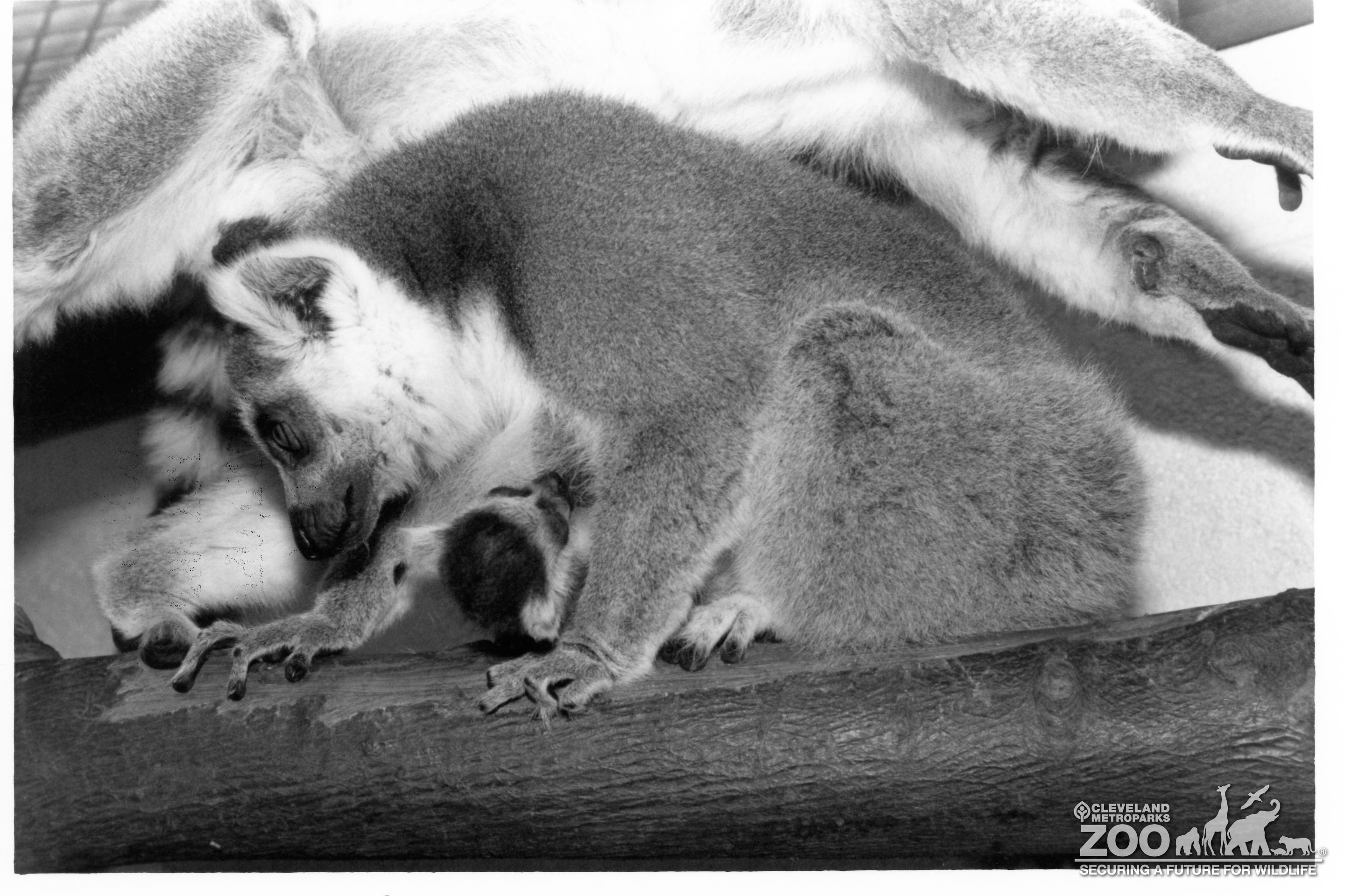 Black & white image of ring-tailed lemur mother with infant nursing. Infant is holding on the mother's chest upside down while she sit on a branch.
