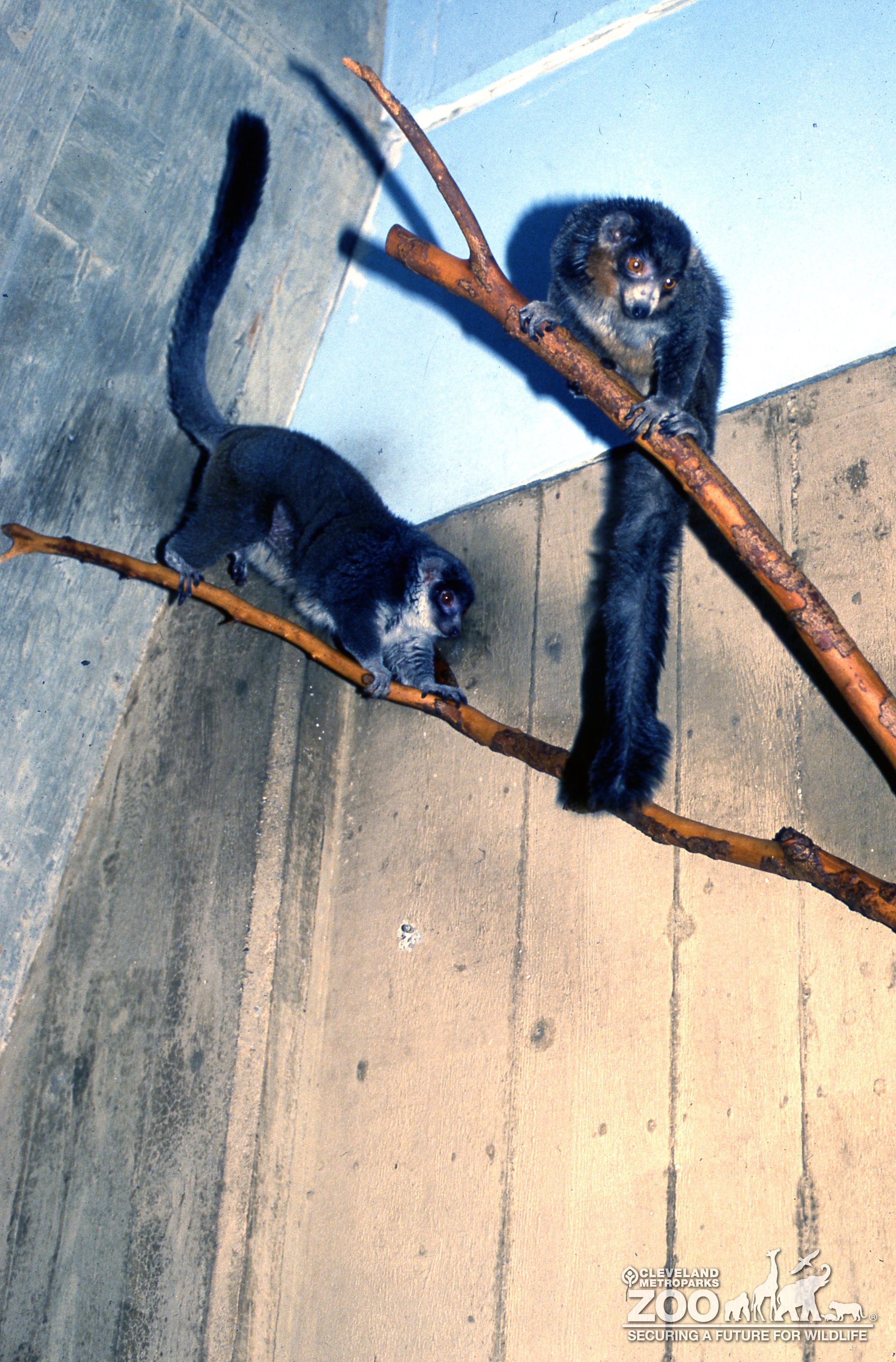 Pair of mongoose lemurs high up on branches in their habitat. They are looking down at you. Animals have long fur covered tails.