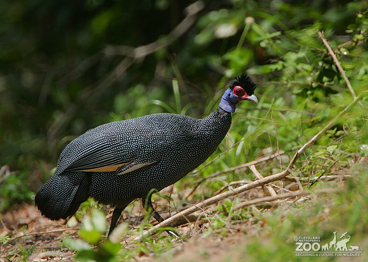 Eastern Crested Guineafowl. This bird is the size of a large chicken, however, its feather are black with small dots of white. It has a black tufted head, red circles around each eye and a blue neck band.