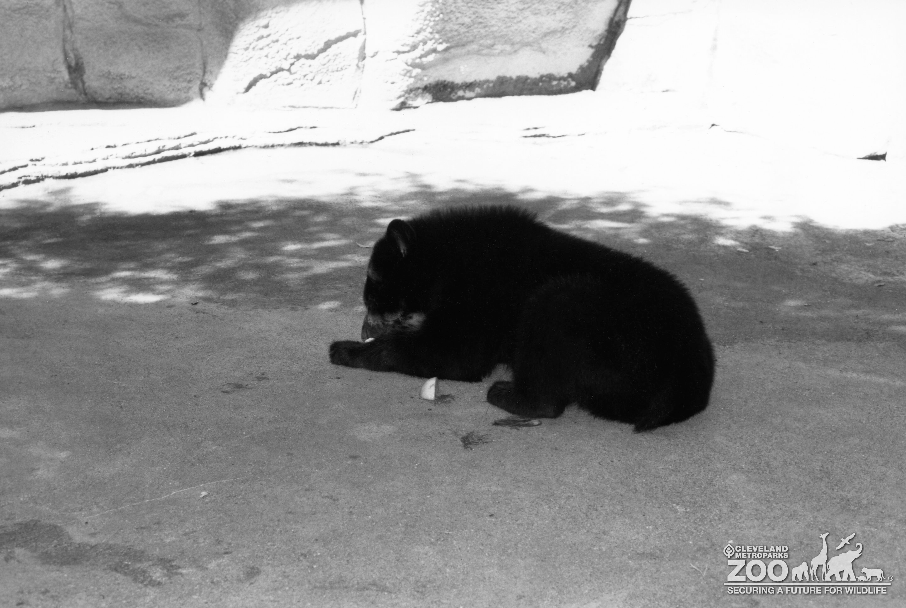This is a black and white photo of an Andean (Spectacled) Bear eating in it's enclosure. The bear is laying in the shade on the dirt ground munching on apple slices. It is covered in black fur with brown fur around it's muzzle as well as flecks around it's eyes giving the appearance that it is wearing spectacles.
