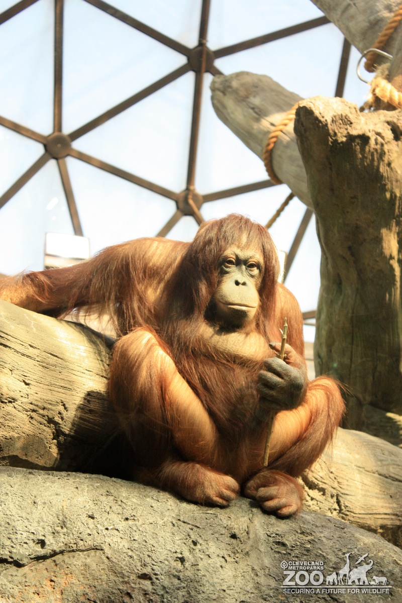 Orangutan sitting under the dome in The RainForest. Images shot looking up at the primate and dome. Sun is shining on the animal.
