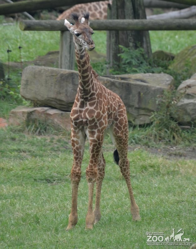 This infant giraffe is standing in the outside yard of the exhibit. It is in a grassy field and large rocks and wooden pole barriers are in the background. This infant looks like a miniature of an adult giraffe. It has brown irregular spots on a tan background for its coloring. Its head is slightly turned away from the camera and you can see its large dark eyes and long eyelashes. Its tail ends in a black fur tassel.