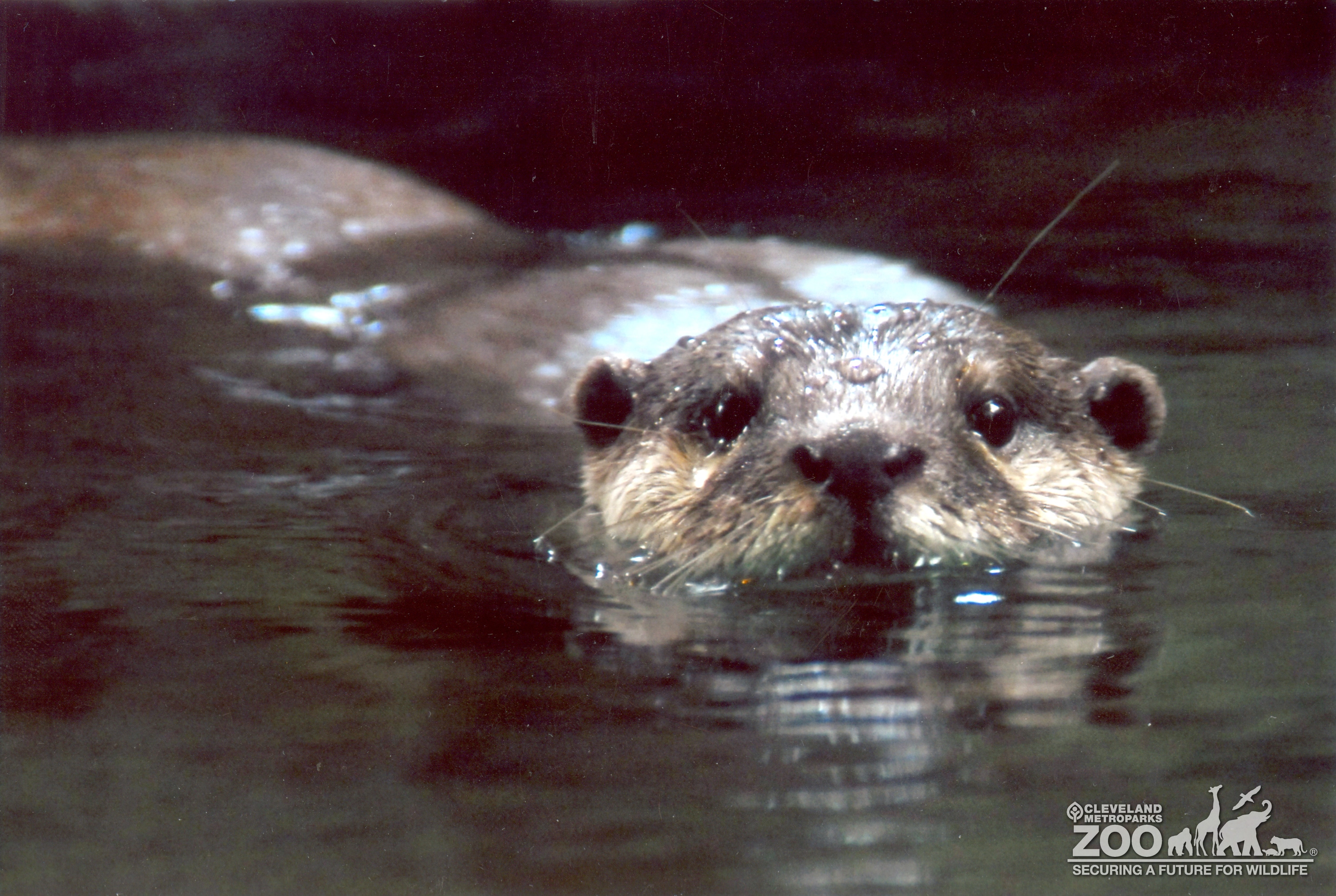 Asian small-clawed otter swimming with head just above the water. It swimming forward. Dark eyes and small rounded ears are visible.
