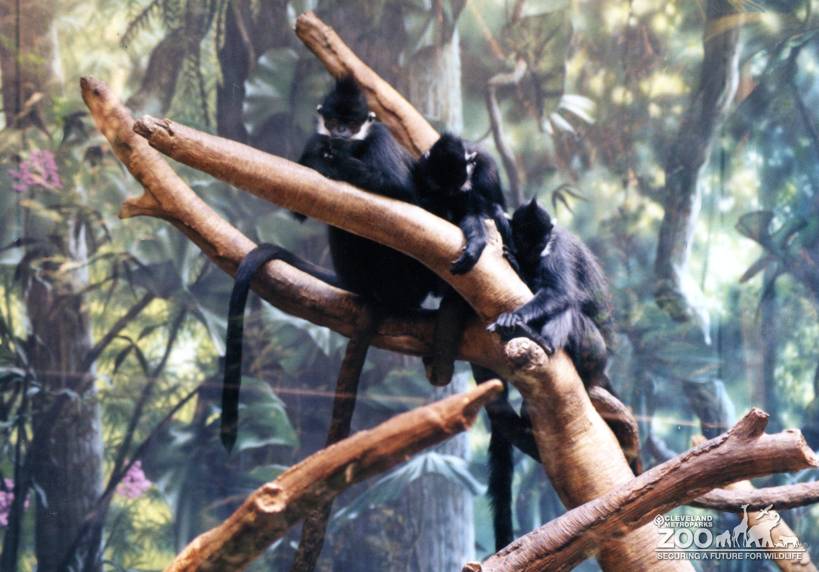 Three Francois langurs in a tree. They are in The RainForest exhibit. Jungle mural provides the background. Animals are all sitting on the man-made branch.