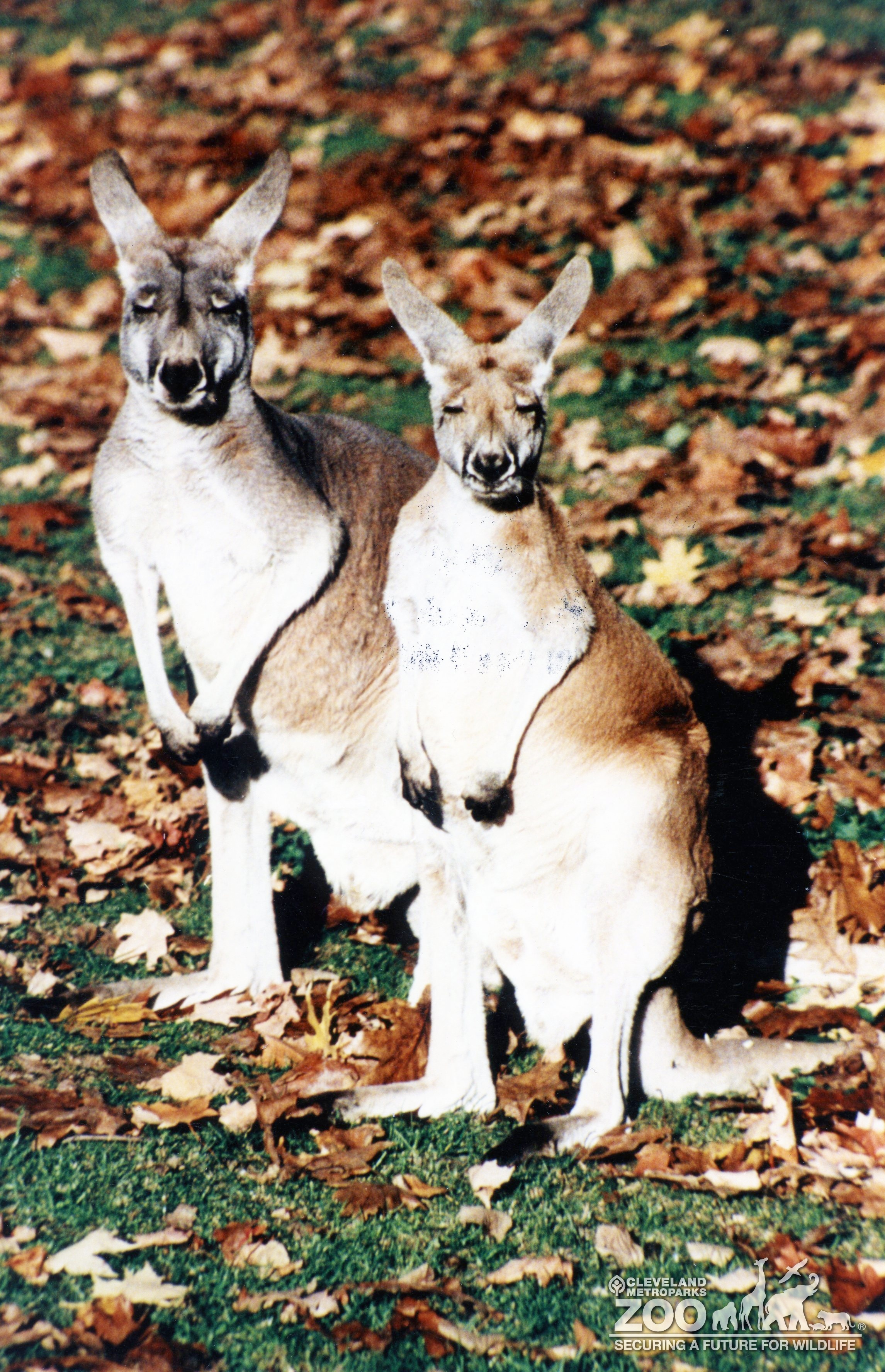 Pair of red kangaroos in their outside exhibit. All around them, on the grass, are brown leaves. Animals are facing forward.