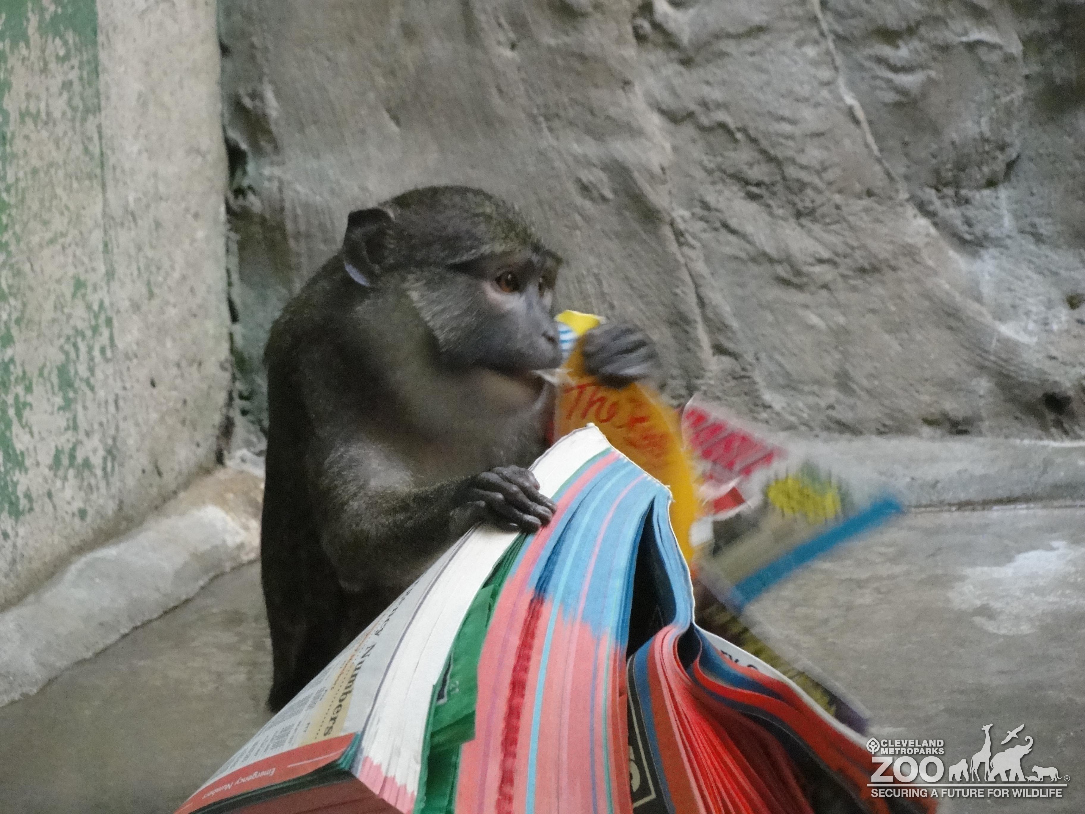 Allen's swamp monkey with a phone book. This item is used for enrichment. Primate is looking to your left. Animal is in the Primate, Cat & Aquatics building. Gray man-made rock wall is in background.