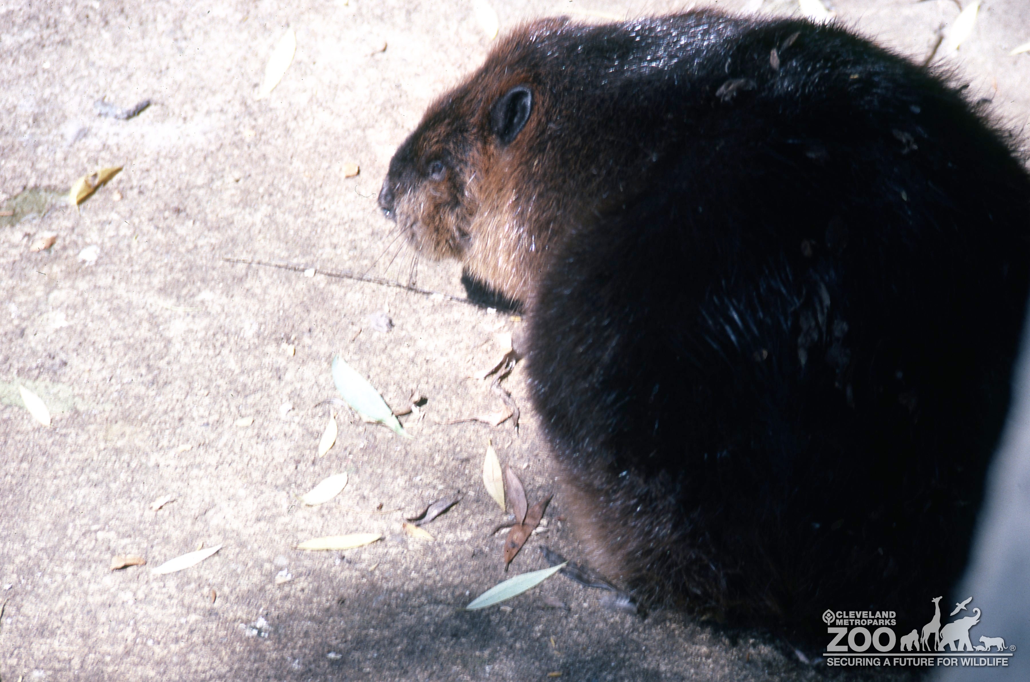 This is a left side profile of a beaver sitting back on its hind legs while leaning its back up against a wall. It looks similar to a rodent and is covered in reddish brown fur. It has small beady eyes and a large black nose.