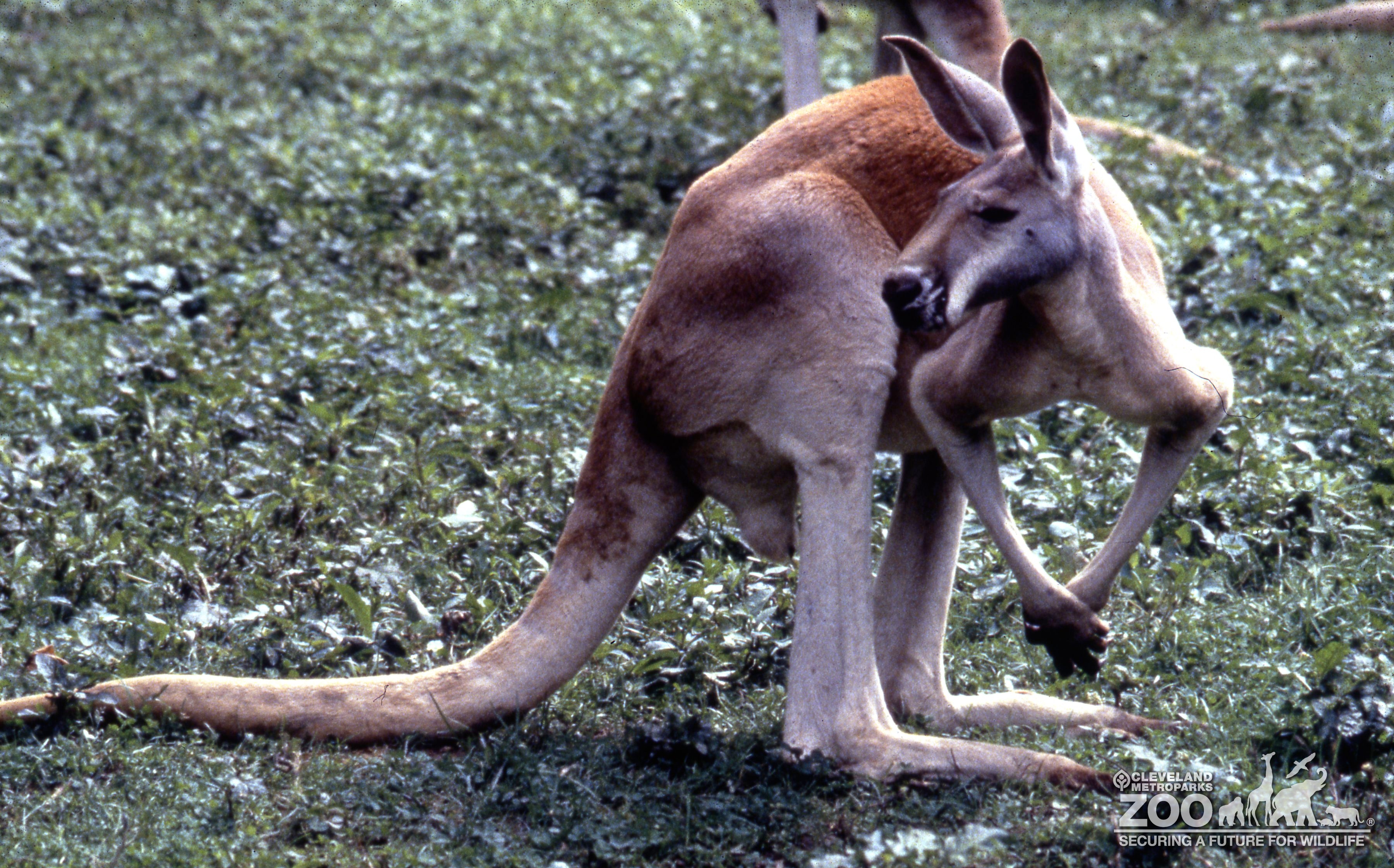 Red kangaroo side view of animal. Head is twisted looking to the left. Balancing on thick tail and hind legs.