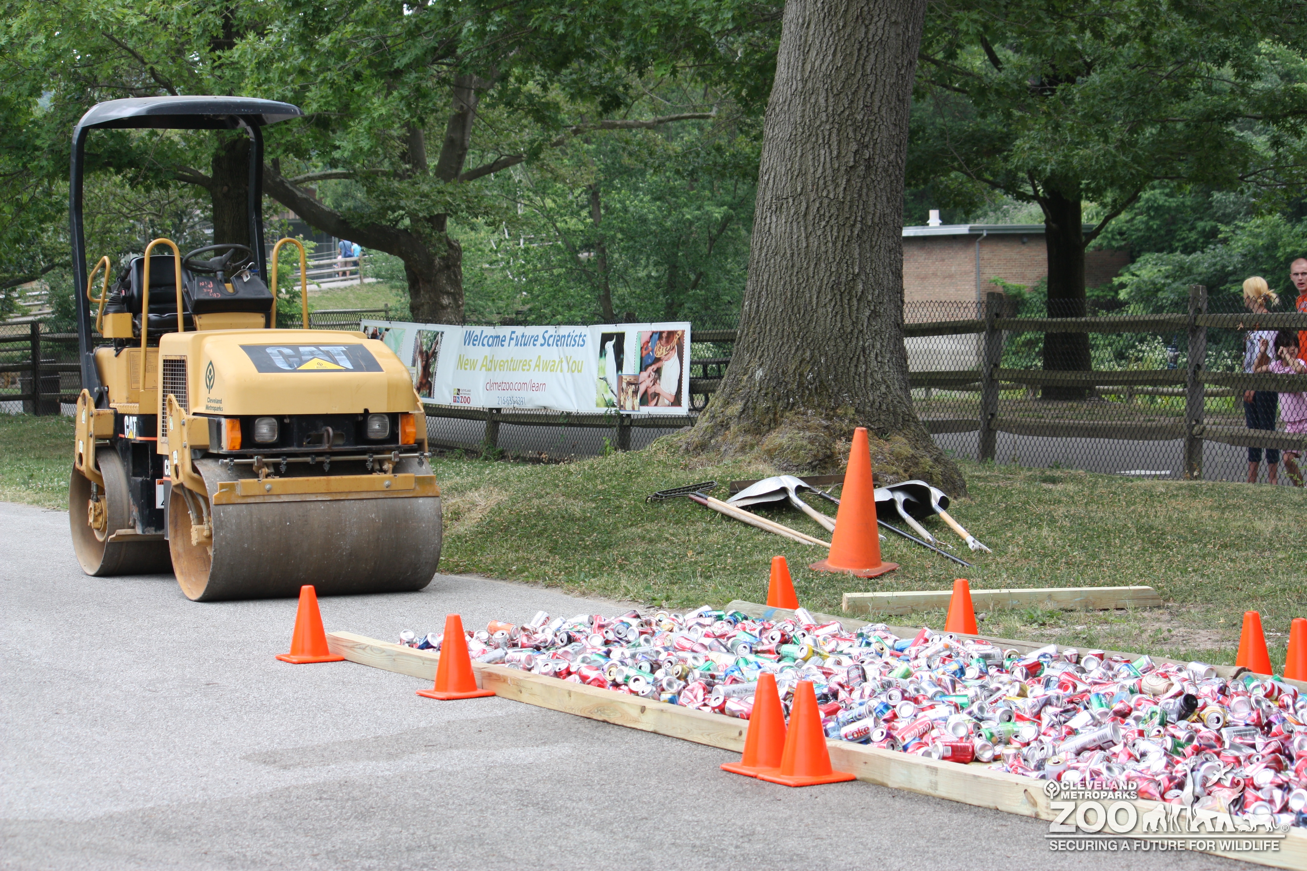 View of cans being crushed on grounds.