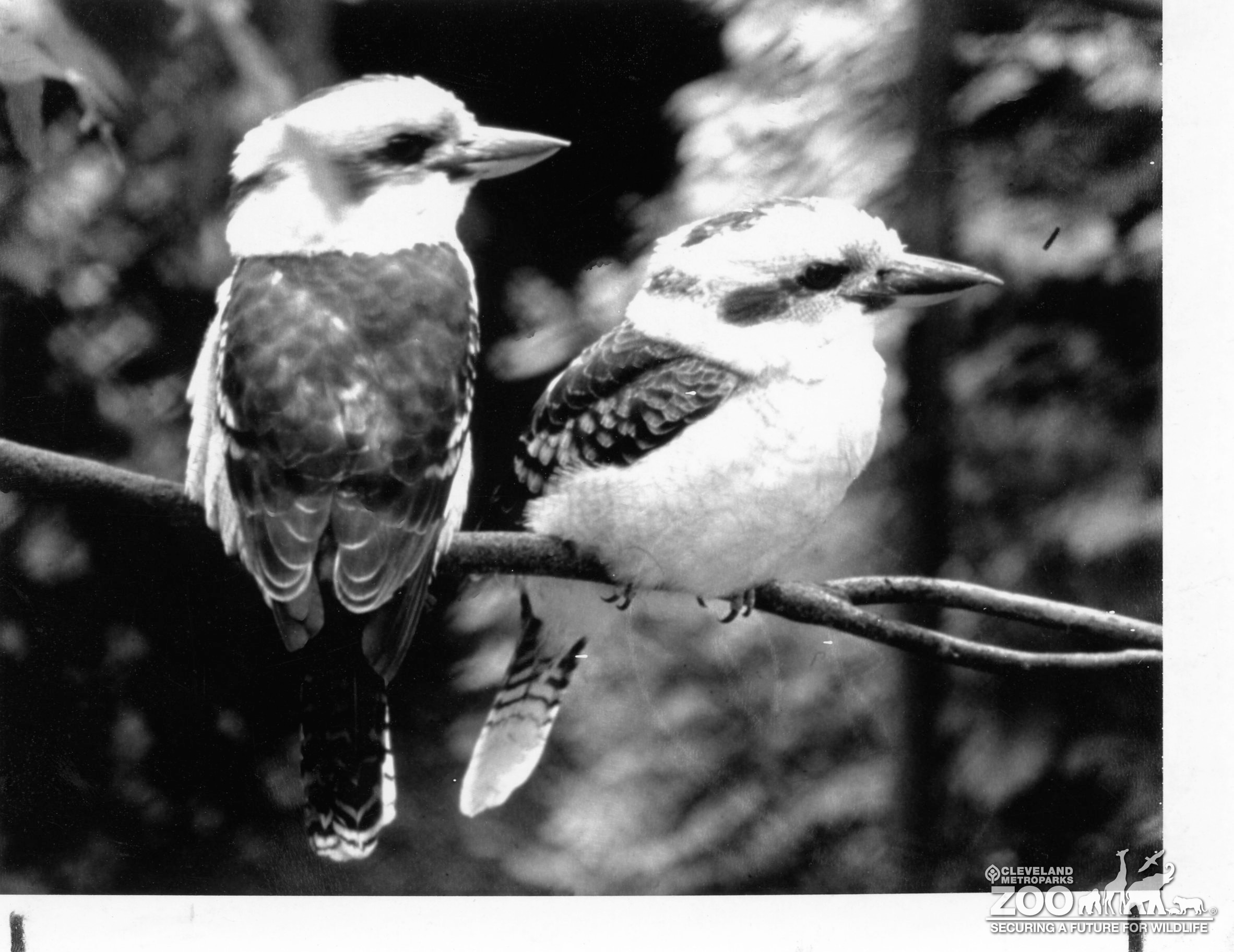 Pair of kookaburra perched on a tree branch. Image is in black & white.