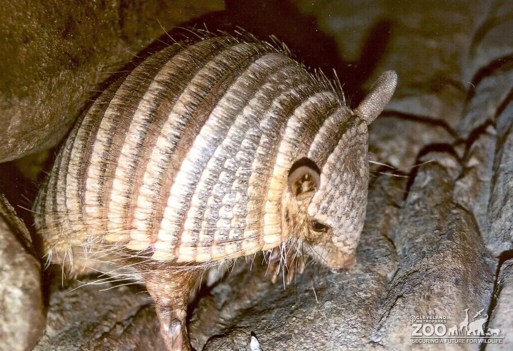 This Hairy Armadillo is standing on a rock huddled inside a cave. The photo shows a detailed view of the right side of the animal. The Armadillo looks similar to a rodent with bumpy armor plating running from the top of it's head and down it's back.
