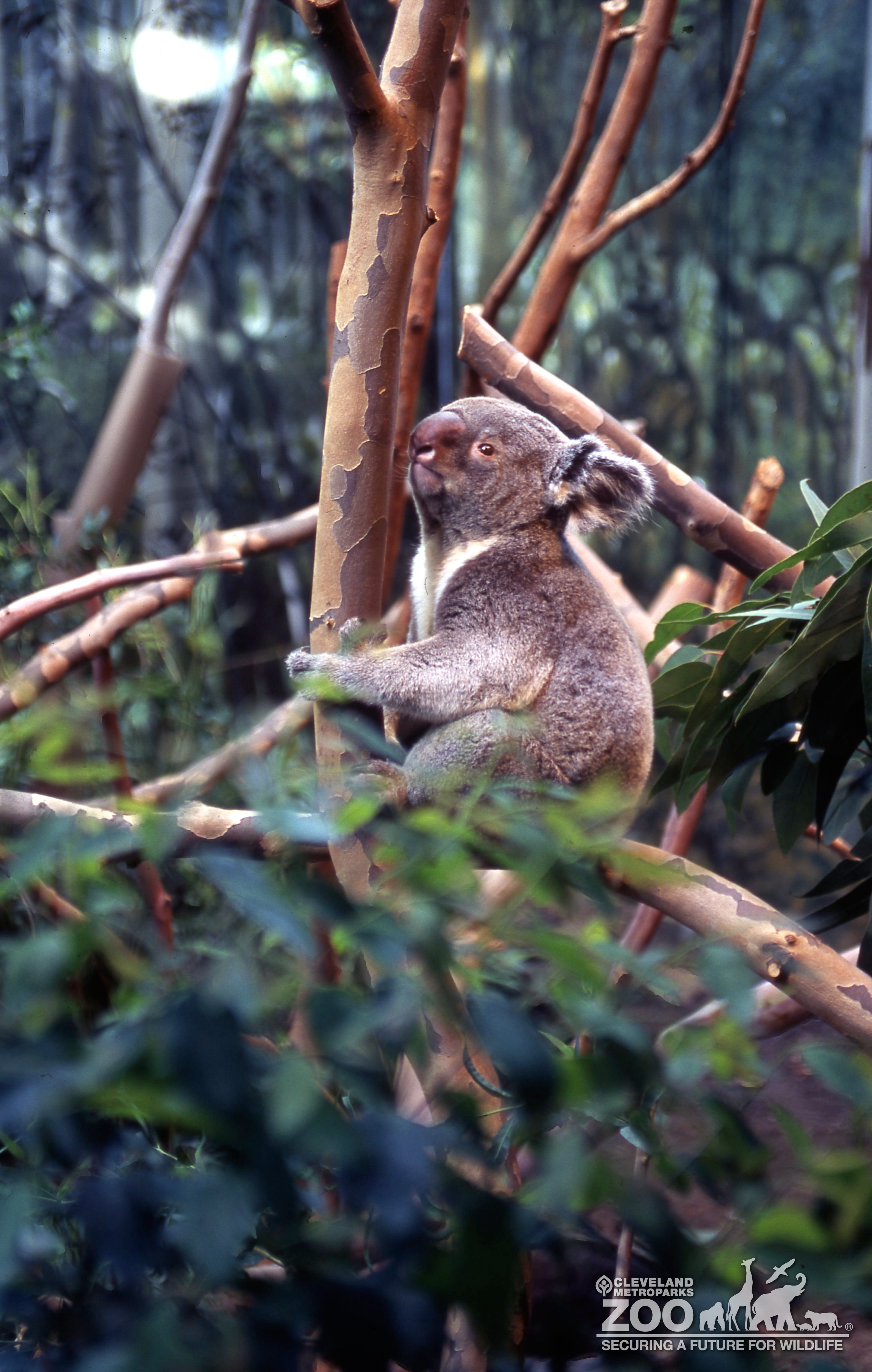 Sleepy koala hugging a vertical branch while sitting on another branch. Eucalyptus leaves surround it. Animal is facing left.