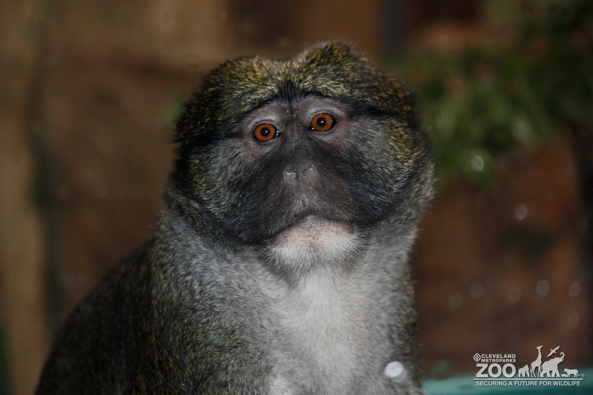 Allen's swamp monkey close-up head shot. It is looking straight at the camera. This smaller primate has light brown inset eyes.