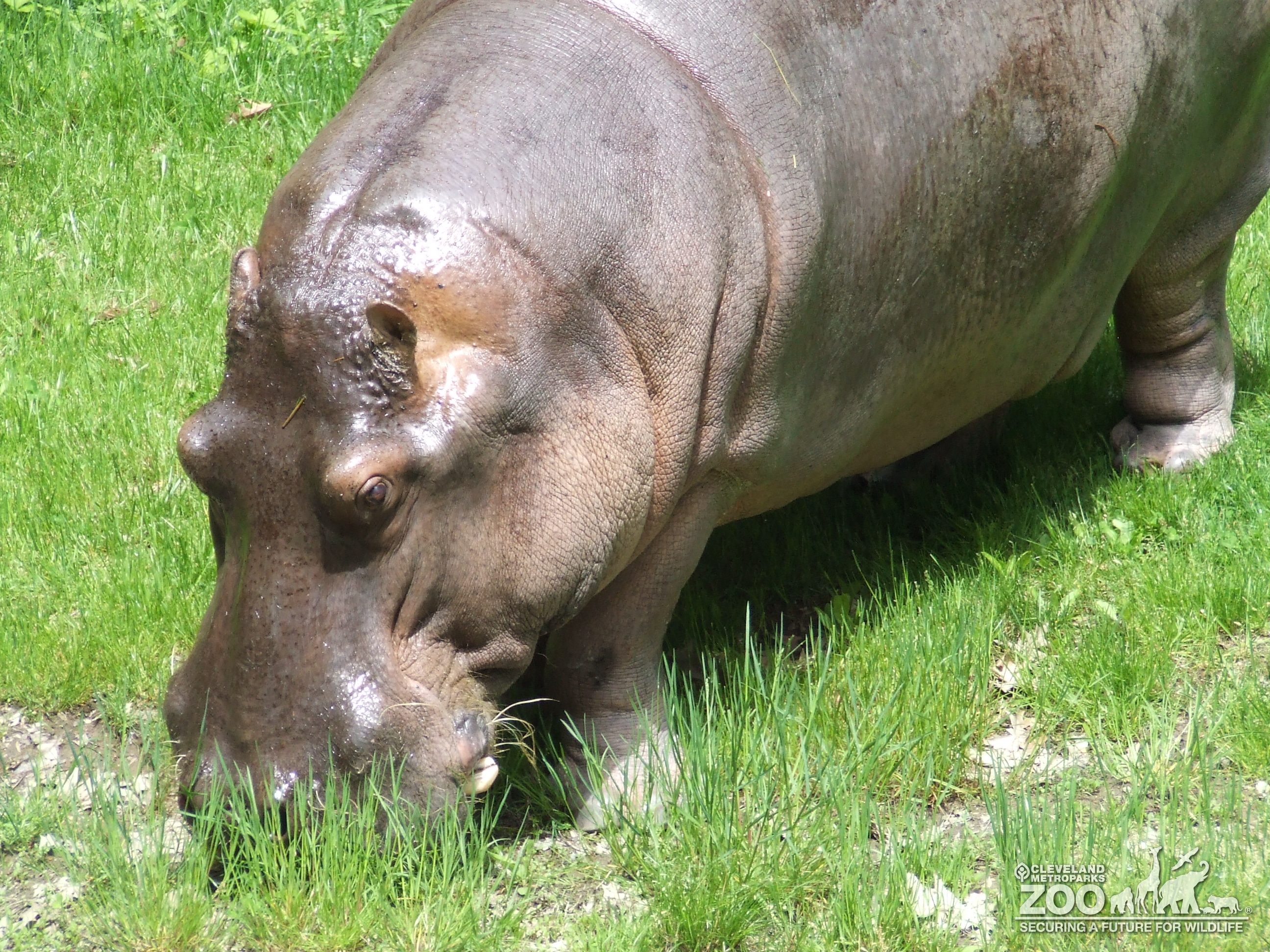 Nile hippo, Blackie, eating grass in his pasture. View shows massive head and body. His skins is shiny and thick.