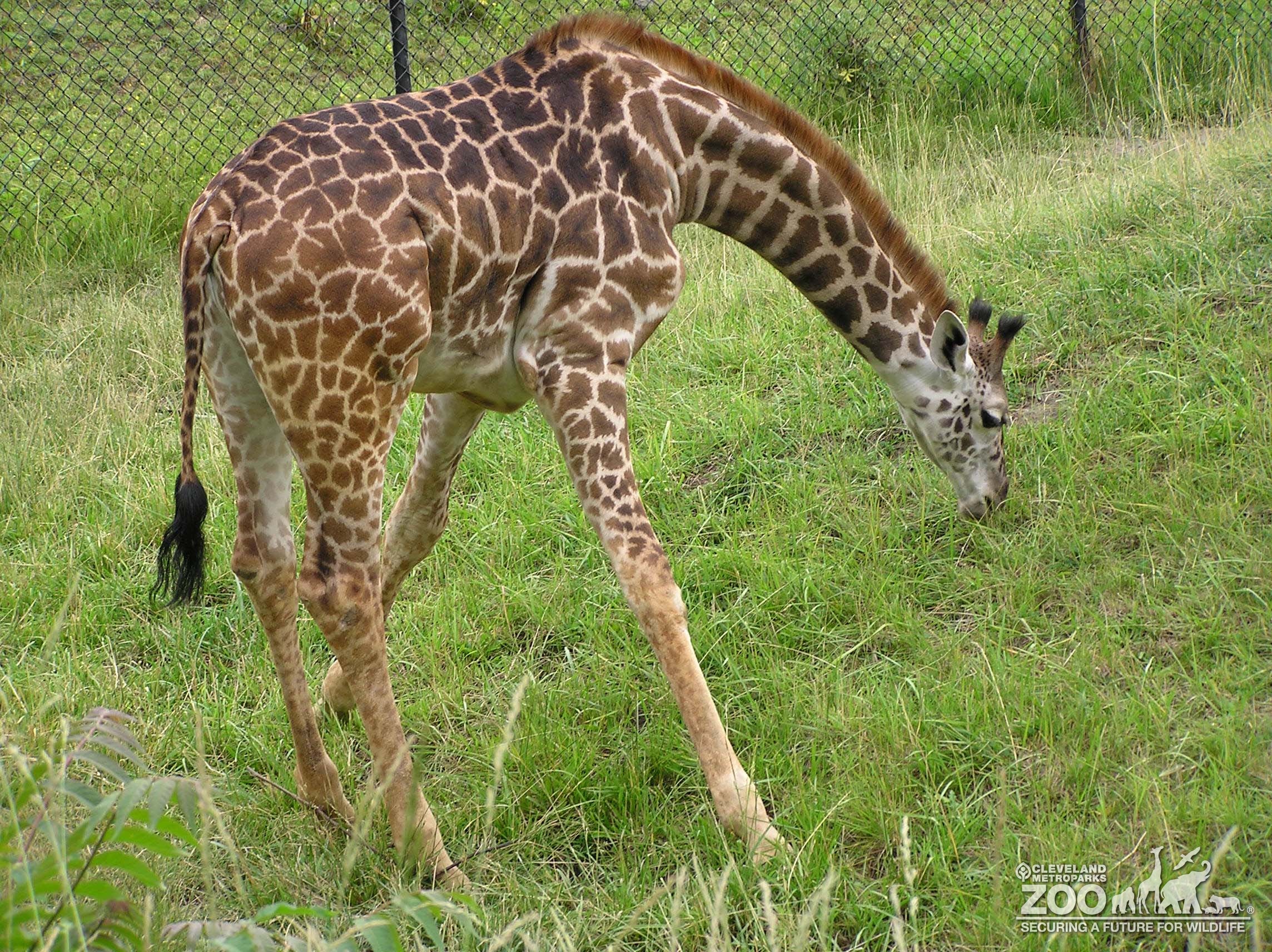 Giraffe is grazing on a small incline in the grassy African Savanna yard. Its neck is bent forward and its front legs are splayed apart to reach the low grass. The irregular brown spots on the animals body are clearly in view.