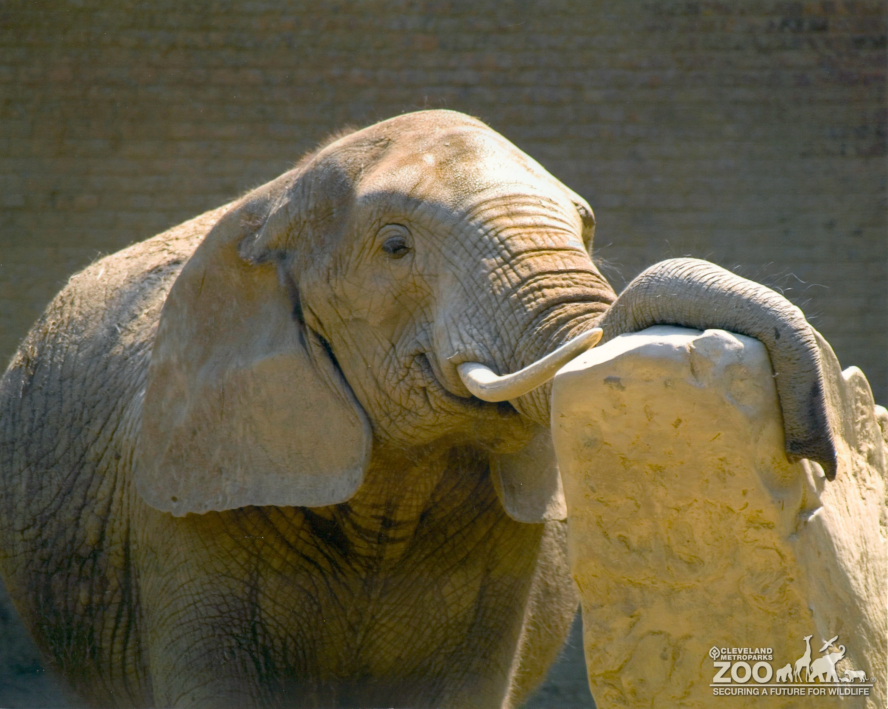 Photo of elephant using it's trunk to scratch on a rock at the Old Pachyderm Building.