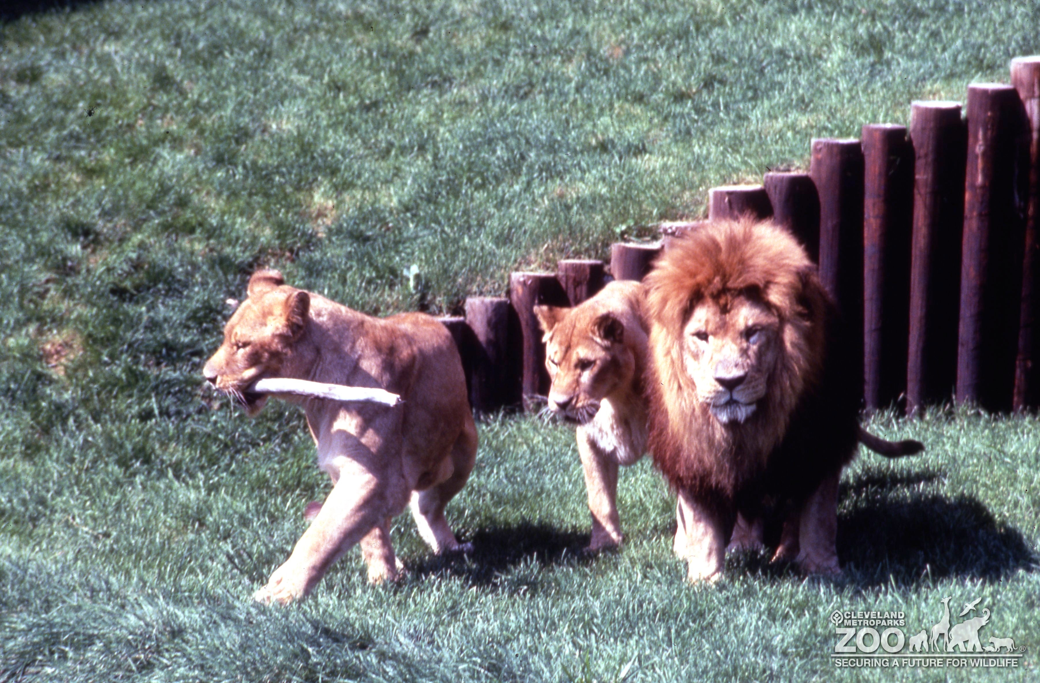 Male and two female lions playing with a stick in the grassy area of the exhibit. Female lion is carrying large stick in her mouth like a dog would carry it.