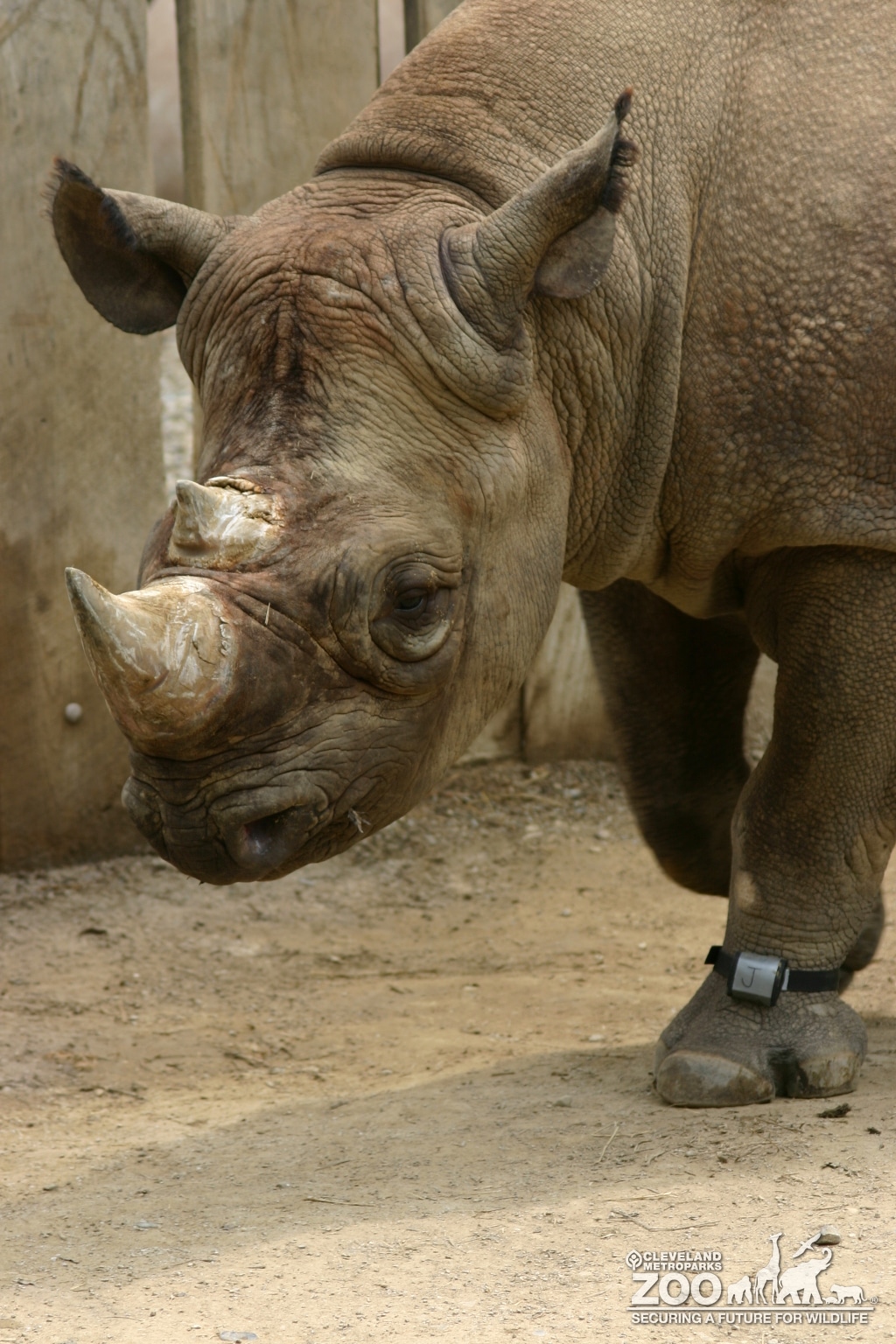 Close up view of rhinoceros head facing left. Rhinoceros has one larger horn in the front on head and a smaller horn behind the first one, both in shades of white and brown. The rhinocerous has brown and gray wrinkled skin on its head and face with bumpy skin on the body. Front left leg is in the photo and has a band around its leg with a small box labeled "J" on it. Left ear pointing back while the right ear faces forward.