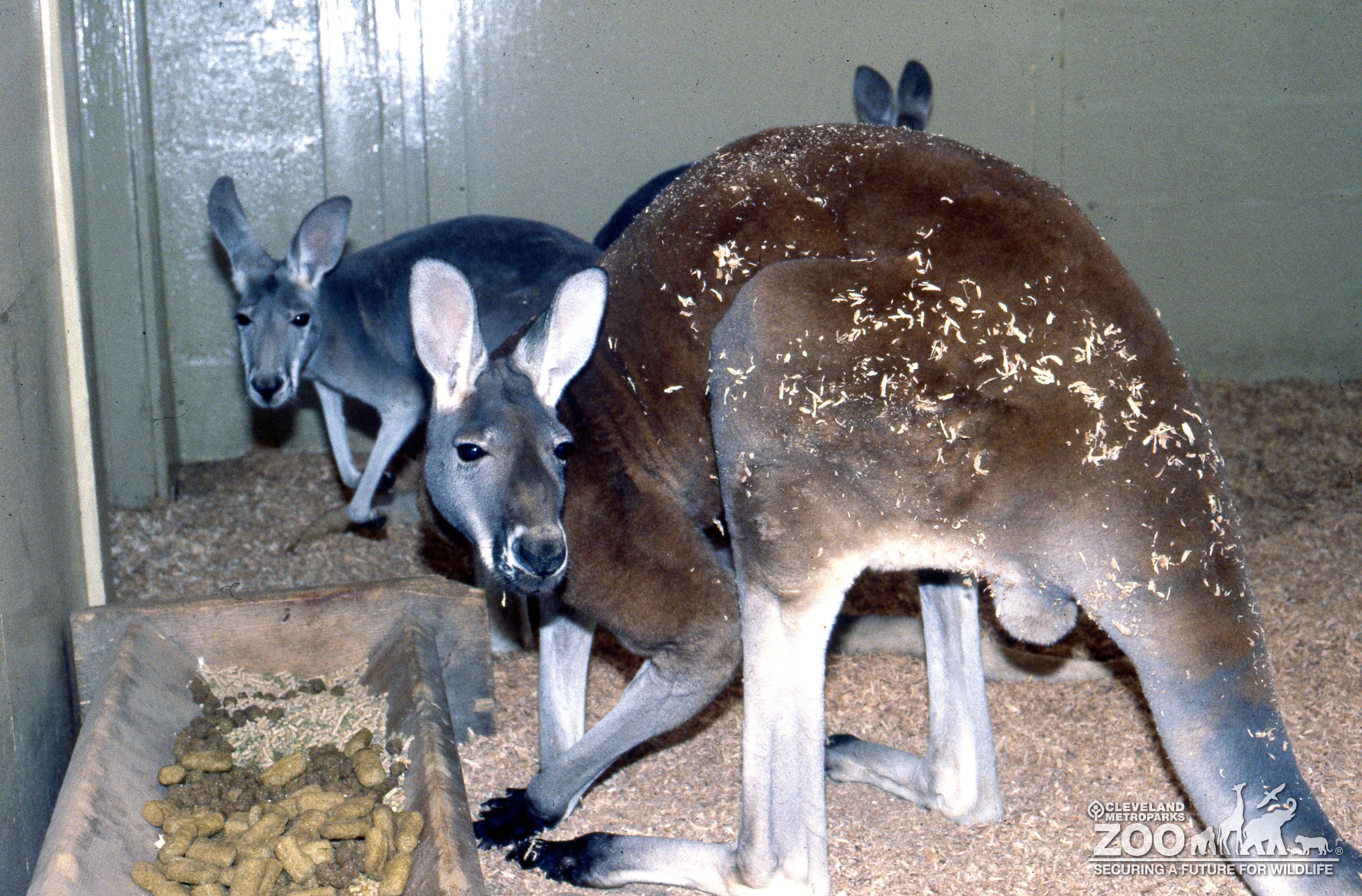 Pair of red kangaroos eating inside their barn. Animals are turned facing the camera while they eat out of a trough.