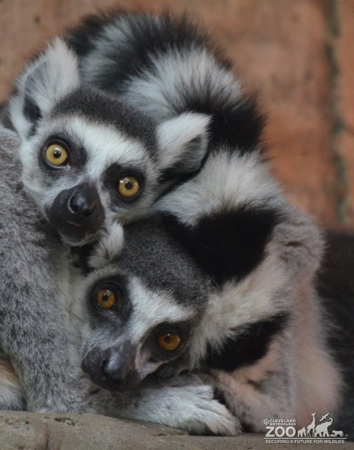 Ring-tailed lemurs up close. The lemurs are bunched together looking straight at the camera. Their round golden eyes with black pupils pull you into the image.