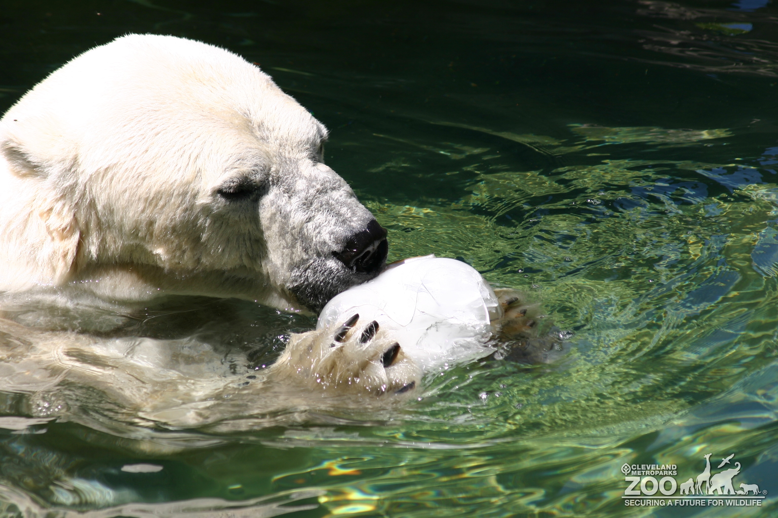 This Polar Bear is floating in water licking a snowball it is holding between its paws. Floating in green water, only the bear's head and front paws are poking out of the water. The bear is covered in short white fur with a black nose and 3 inch long black nails.