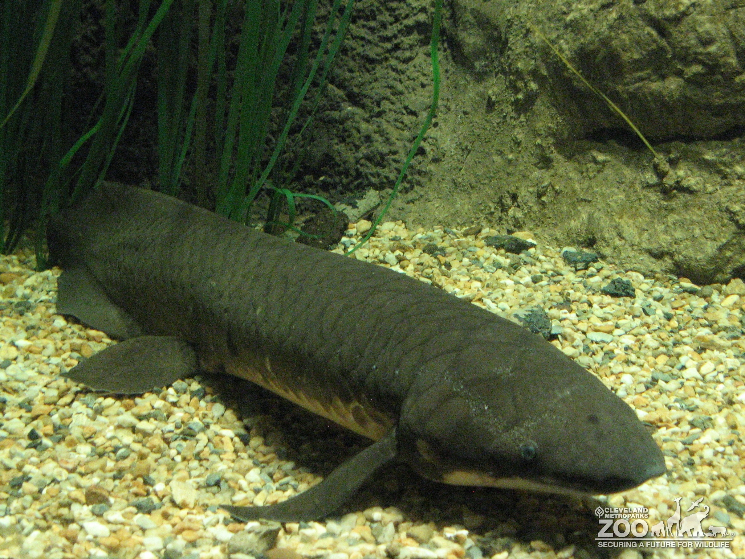 Australian lungfish swimming in exhibit tank. Large gray fish defined scales.