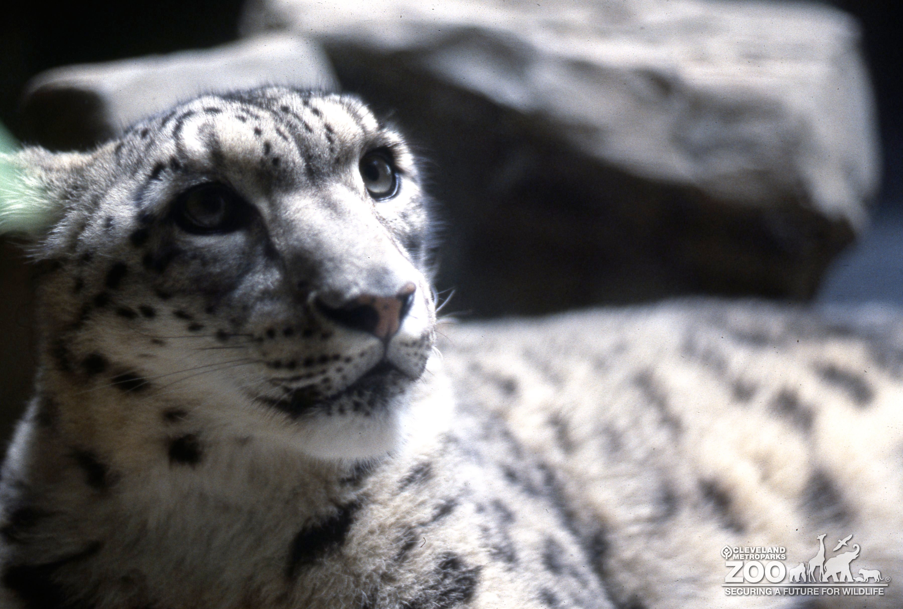 Snow leopard close-up of face looking upward. Large gray eyes are visible. Cat is laying down. Image is mostly gray tones little color.