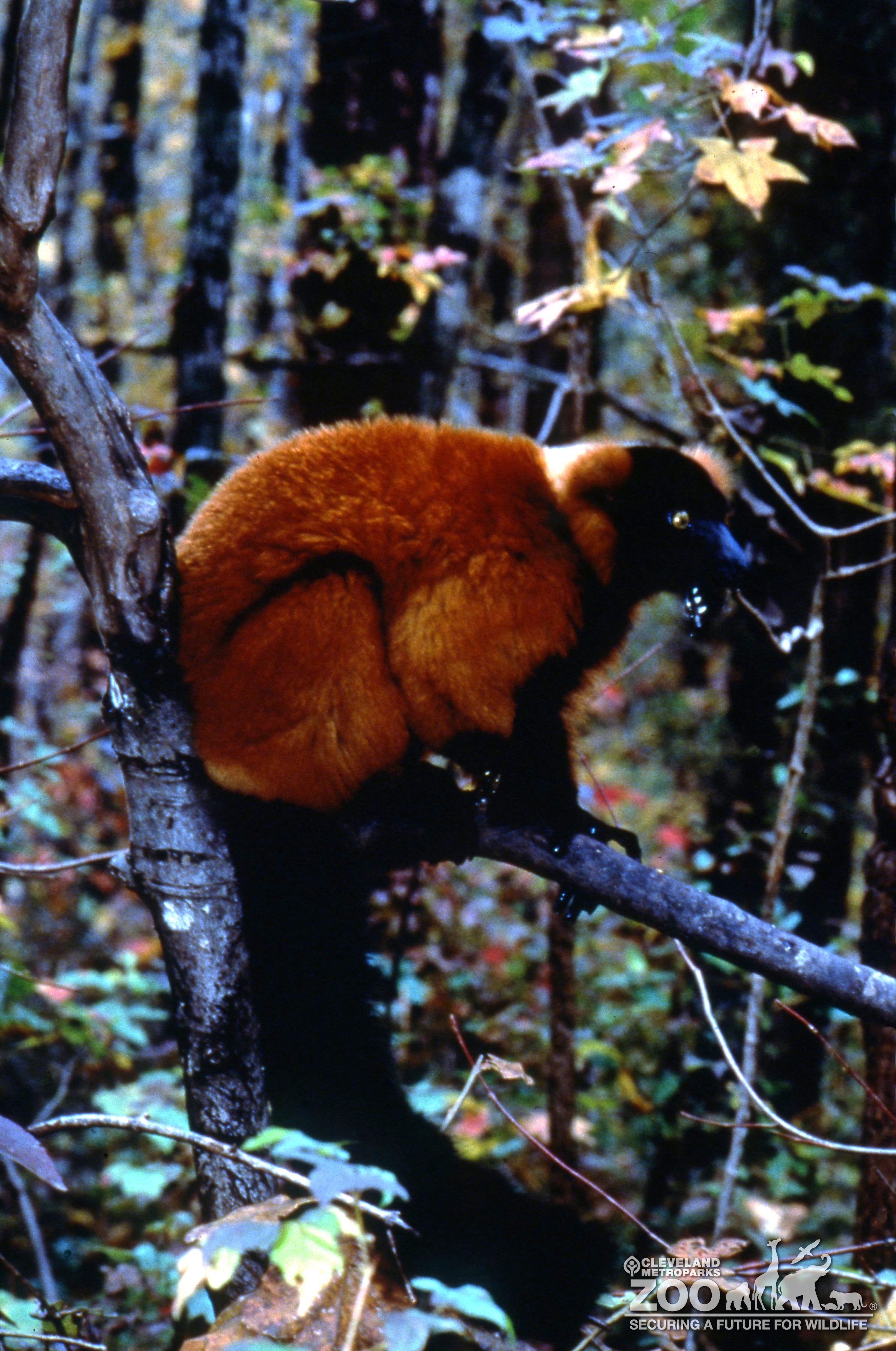 Red-ruffed lemur sitting on a tree branch in a leafy canopy. This is a side view of the animal. Its has a long black fur covered tail.