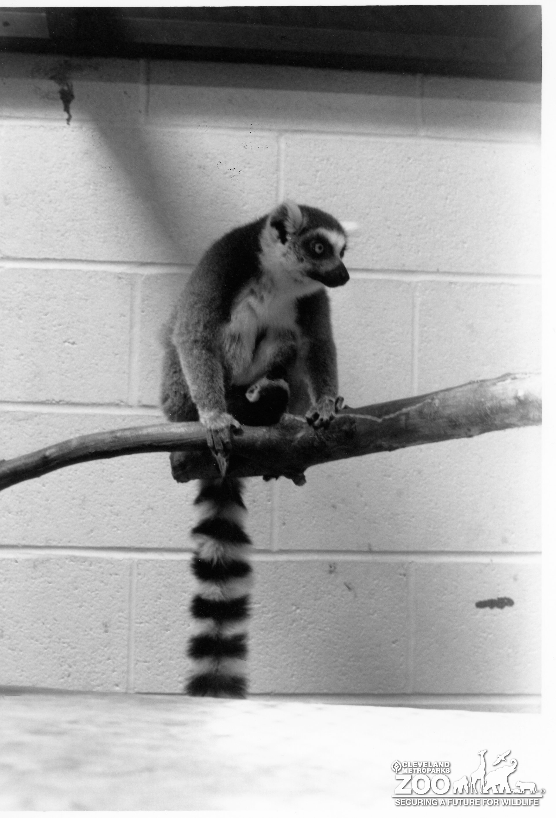 Black & white image of ring-tailed lemur mother and infant on an exhibit branch. Infant's face is buried in the mother's furry chest.