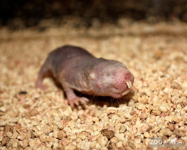 Naked mole-rat close-up. This hairless rodent it facing the camera with it large from it out front. It is crawling on small gravel.